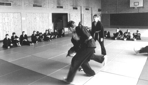 Wir zeigten den Jugendlichen wie sie sich auf der Matte bewegen müssen, um alle Angreifer im Sichtfeld zu behalten. Danach zeigten wir ihnen wie sie aus einer Ecke wieder herauskommen, wenn sie doch einmal hineingedrängt werden. Zum Abschlußstanden noch Abwehrtechniken gegen Messer, Stock und Schwert auf dem Programm.