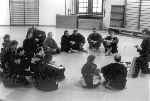 Von der richtigen Handhaltung, über den Angriff an verschiedene Punkte des Körpers, bis hin zur Verteidigung mit und ohne Messer wurde alles eingeübt und ausprobiert. Allen Teilnehmern wurde im Laufe des Tages klar, daß das Messer eine sehr gefährliche Waffe ist, gegen die man sich nur schwer verteidigen kann, und die man nicht unterschätzen darf.