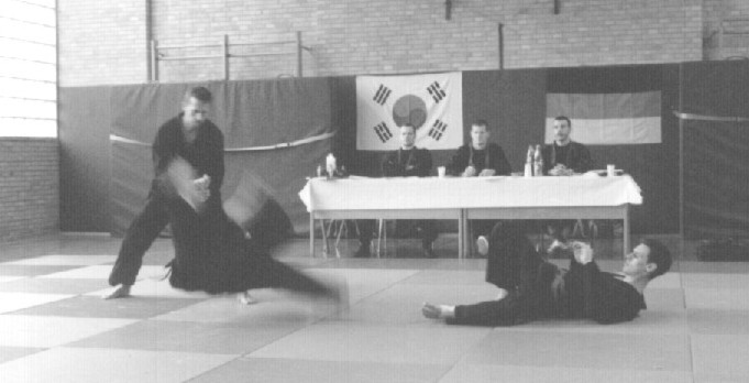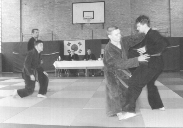 Wenn ich nun zurückblicke, hätten nicht nur wir, sondern alle Prüflinge das Wort "Danvorbereitungszeit" doch deutlich genauer nehmen sollen. Unser Fachverband schreibt eine Mindestwartezeit von einem Jahr nach der letzten Kup Prüfung vor, bevor man sich der Danprüfung stellen darf. Meiner Ansicht nach besteht die größte Schwierigkeit darin, sich diese Zeit angemessen einzuteilen. An sich gesehen, ist ein Jahr eine sehr kurze Zeit um sich auf den schwarzen Gürtel vorzubereiten. Nicht daß die Techniken besonders schwierig sind, oder daß uns dafür besonders viele Techniken aufgebrummt werden. Ich finde, daß eine solche Prüfung ein Anlaß ist, um sein komplettes Fachwissen noch einmal zu überarbeiten und auf den neuesten Stand zu bringen. Es reicht nicht aus, ein paar Sprungfußtechniken, die Messertechniken und eine Hyong zu erlernen, dafür braucht man kein Jahr! Mittlerweile legen unsere Danprüfer die Meßlatte auch so hoch an, daß man mit diesem Wissen keinen schwarzen Gürtel mehr bekommt.