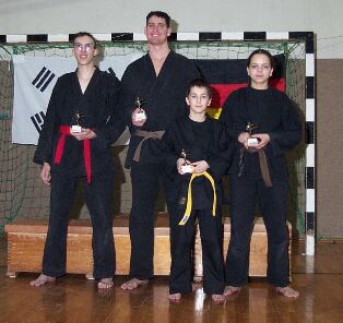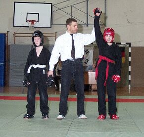 Leider konnten wir in diesem Jahr keine eigene Klasse für die Mädchen eröffnen, daher mußten sie sich mit den Jungen ‚herumschlagen'. Für den Fall das dies zu hart geschehen sollte war bei diesem Turnier der Maltesa Hilfsdienst aus Herzebrock-Clarholz mit in der Halle. Diese Kameraden haben sich ein besonderes Lob für Ihre mehr als professionelle Hilfe verdient, auch wenn wir sie fast nicht gebraucht haben. Die gute Ausbildung der Kämpfer hat sichtbare Früchte getragen. Über die ein oder andere Technik läßt sich sicherlich streiten, aber insgesamt haben sich die Teilnehmer in diesem Jahr faire und ausgeglichene Kämpfe geliefert. Dies haben wir von der Jugendleitung immer wieder gefordert und durch die intensive Ausbildung auf den Lehrgängen ist uns das auch endlich gelungen. Dazu haben die Trainer in den Vereinen sicherlich auch viel beigetragen. ABER, eins müssen unsere Schüler noch lernen! Es darf nur über der Gürtellinie getreten werden. Dies schreibe ich nicht, weil gerade so ein Tritt einen meiner Schüler gleich mehrfach niedergestreckt hat, sondern weil ich bei der Auswertung der über einhundert Wettkampffotos gleich SECHS Beweise gefunden habe, von denen wo es nicht eindeutig war ganz zu schweigen ;o) Aber dafür gibt es die Vorbereitungslehrgänge im nächsten Jahr.