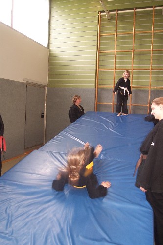 Meike Betzler (I Dan) und Jürgen Rath (IV Dan) verdeutlichten den Jugendlichen wie man sich Angreifern gegenüber behaupten kann. Um das dafür nötige Selbstvertrauen zu schaffen standen immer wieder Übungen zur Körpererfahrung auf dem Programm wie rückwärts auf eine schräge Matte fallen, ohne sich abzustützen, oder im Randori gegen andere bestehen. Genau so wichtig waren auch viele Grundschläge und Tritte, deren Studium sich oft auch in eine Übung zur Selbstdisziplin verwandelte.
