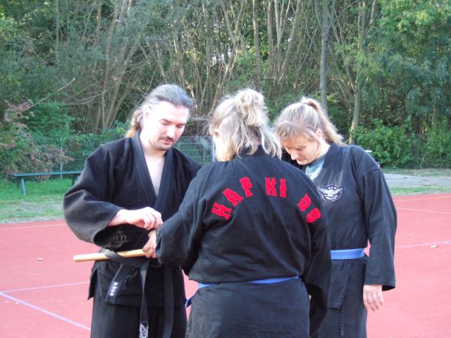 Als wir dann das erste Gefühl für den Pong erreicht hatten, gingen die Referenten zu den Grundschlagtechniken und Blöcken am Partner über. Darauf folgten Abwehrtechniken mit dem Pong und zu guter Letzt die Messerabwehr.