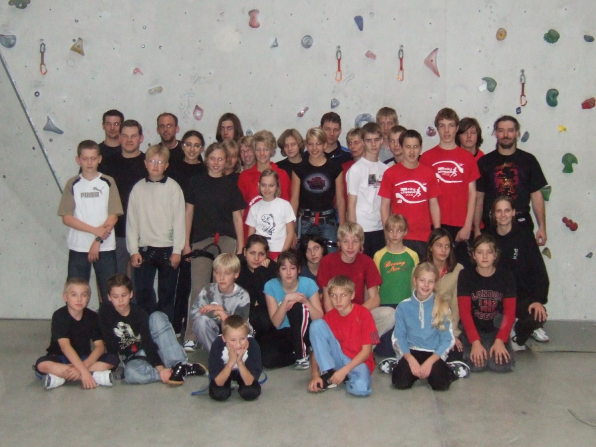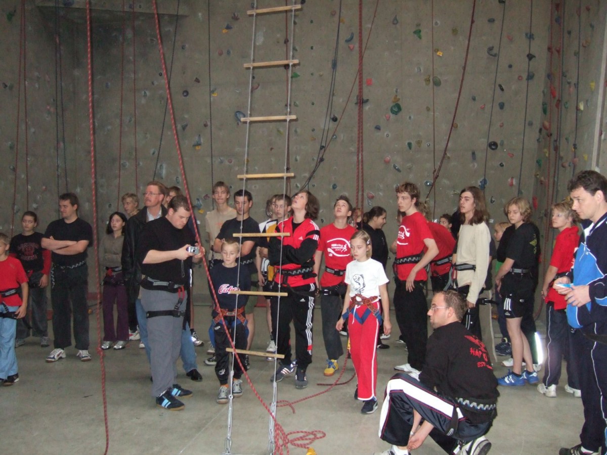 Schnell wurde aber auch klar, das Klettern anstrengend ist und die Kraft in Händen und Armen schneller nachlässt als es vielen Lieb war. Eine besondere Herausforderung war das Klettern mit verbundenen Augen oder das Klettern als Dreibein, bei dem zwei Kletterer mit einem Tuch an einem Bein zusammengebunden werden.