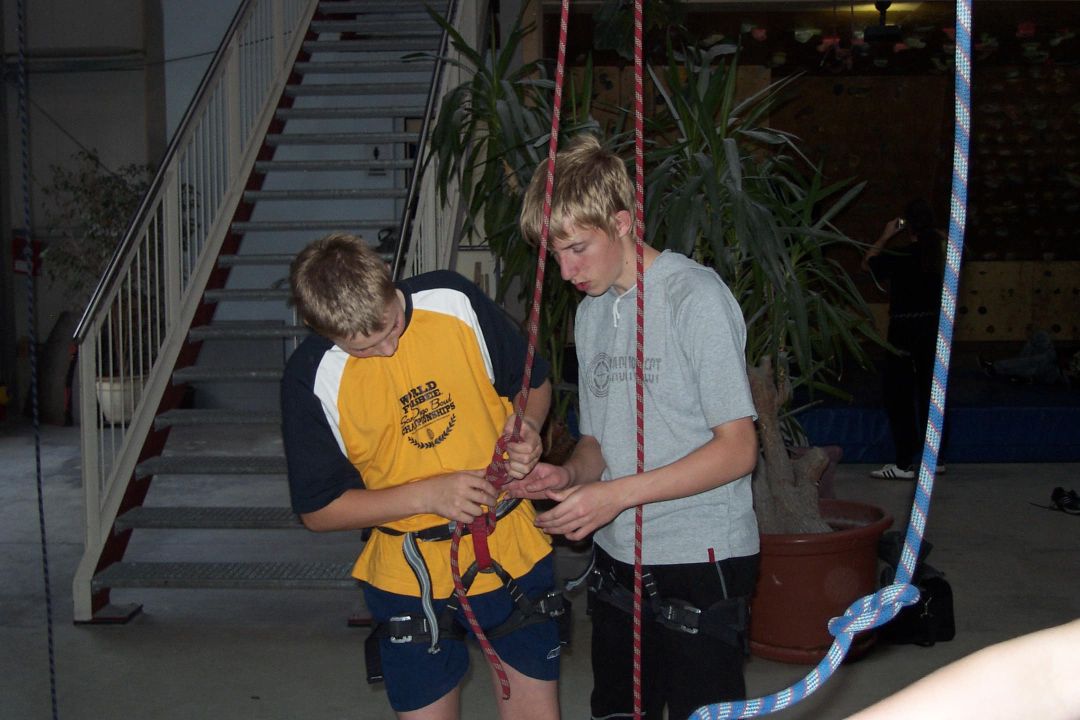Nach der Einweisung in die Sicherungsanlagen und dem erlernen des Doppelachter-Knotens stürzten sich die Jugendlichen in die bis zu 16 Meter hohen Kletterwände. Dank einer speziellen Sicherungsanlage konnten die meisten Jugendlichen sich gegenseitig sichern, ohne sich mit aufwendigen Knoten und anderem befassen zu müssen. Das Personal der High-Hill Kletterhalle stand ihnen dabei stets zur Seite.