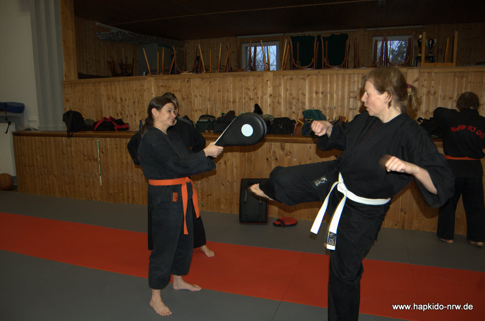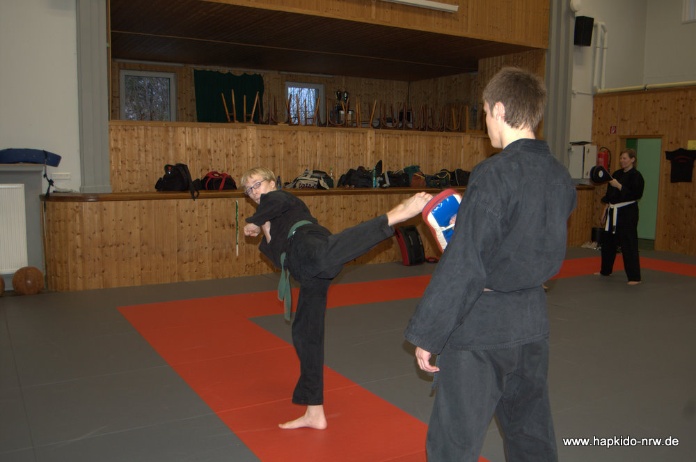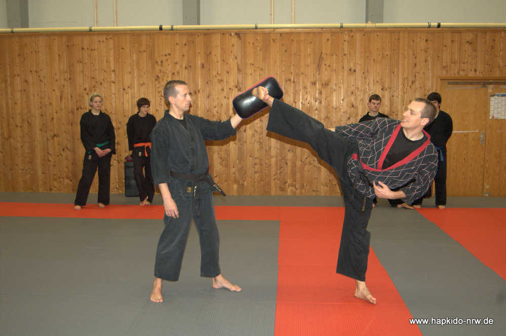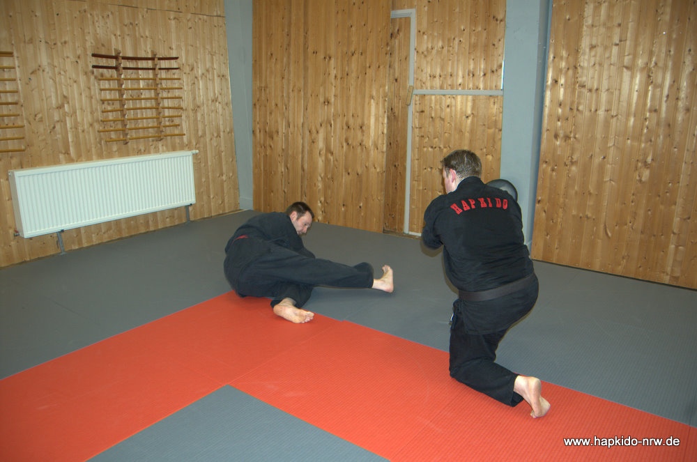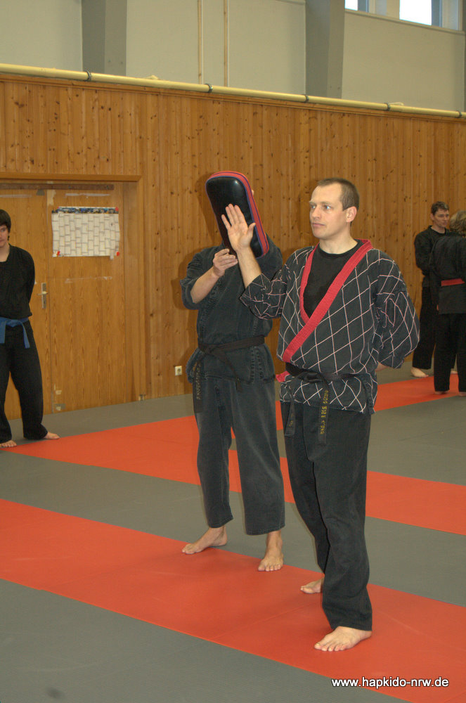 Der blaue Gürtel im Hap Ki Do ist ein entscheidender Punkt in der Laufbahn eines Hapkidoin. Die Techniken werden zunehmend dynamischer, Fauststöße müssen abgewehrt und umgeleitet werden. Um diese komplizierte Materie weiter zu durchleuchten, wurden für diesen Lehrgang zwei Tage angesetzt. Guido Böse nutzte die Lehrgangszeit um sich mit allen Prüfungsthemen ausgiebig zu befassen. So bot sich den Teilnehmern die Gelegenheit sich mit den Fußtechniken und der Fallschule unter fachkundiger Anleitung auseinander zu setzen. Auf die Bewegungsschule legte er ebenfalls viel Wert, da sie gerade im Blaugurt für die dynamischen Techniken eine ideale Vorübung darstellt. Die einzelnen Handtechniken wurden besonders am zweiten Lehrgangstag intensiv behandelt und es gab für jeden Lehrgangsteilnehmer reichlich Zeit zum üben, genau so wie viele hilfreiche Tips.