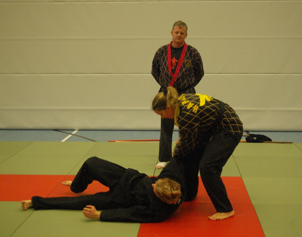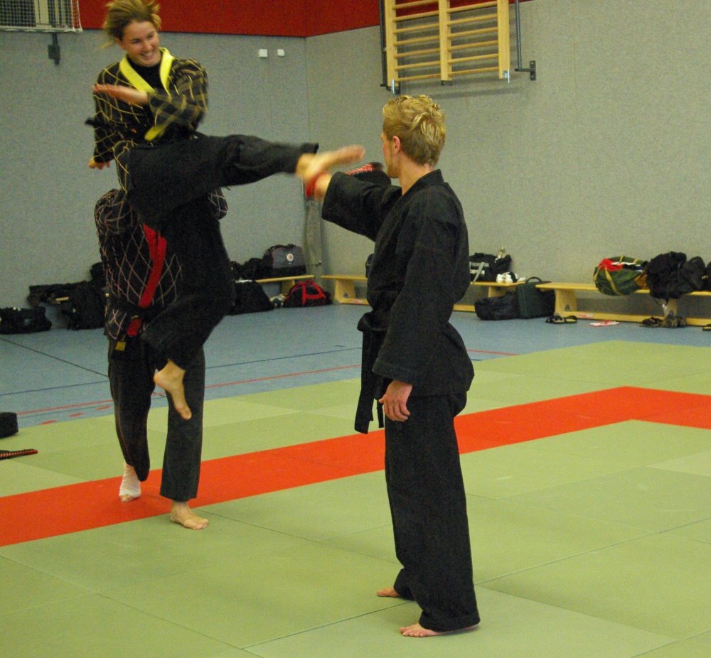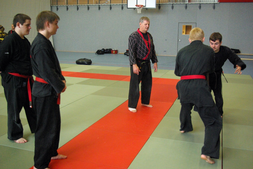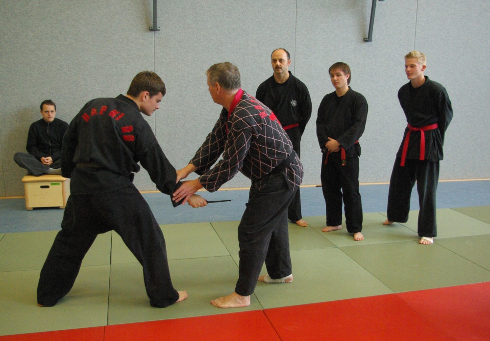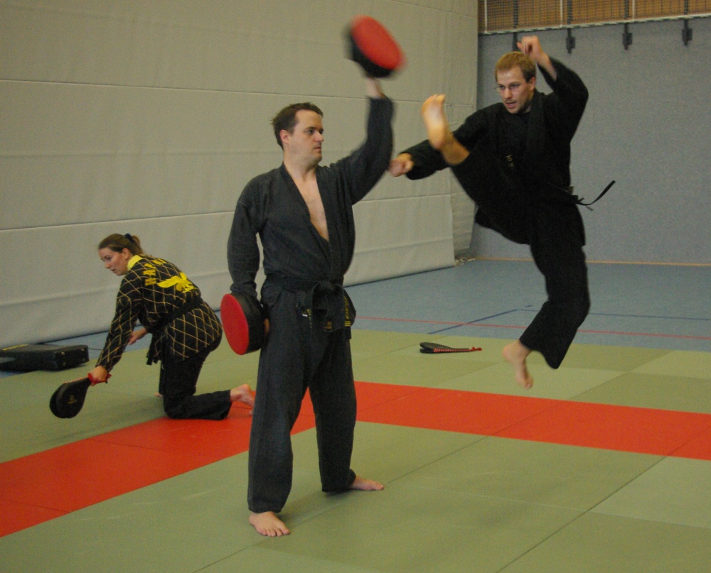 Da in der Nacht zum Sonntag die Uhren auf Winterzeit umgestellt wurden, hatten die Teilnehmer morgens eine Stunde mehr Ruhe, um sich auf den bevorstehenden Trainingstag vorzubereiten. Schwerpunkt waren an diesem Tage die Techniken für den jeweils angestrebten Dangrad. Die Begutachtung der gesprungenen Fußtechniken fiel recht zuversichtlich aus und bewies den bereits erworbenen guten Trainingsstand der Kandidaten. Bei den Handtechniken widmete sich Franz-Josef Wolf, speziell in den Messerabwehrtechniken, den Aspiranten für den ersten Dan. Hierbei wurde jede Technik noch einmal gründlich auseinandergelegt und ihre Prinzipien erläutert. Auch wenn manche Bewerber feststellen mussten, dass sie noch Verbesserungsbedarf hatten, war ja gerade dies Zielsetzung des Lehrgangs, Feinschliff zu bekommen, um die letzten Wochen bis zur Prüfung noch einmal optimiert trainieren zu können. Nicht zuletzt erhielten aber auch die Kandidaten für die anderen Dangrade wertvolle Tipps und fachmännische Hilfe für ihre Techniken.