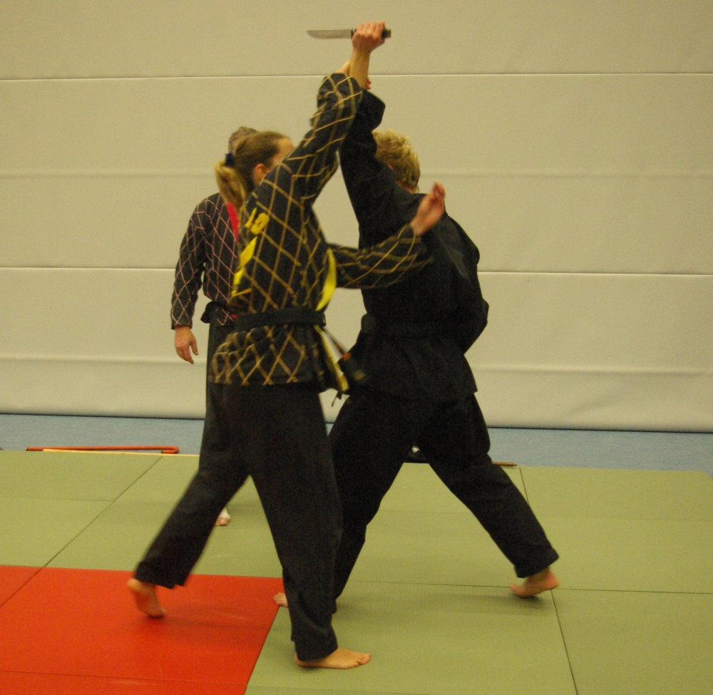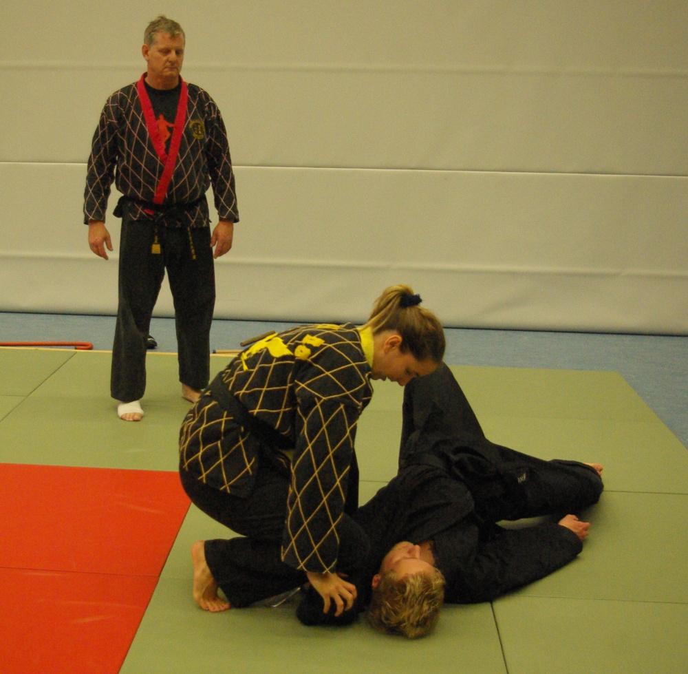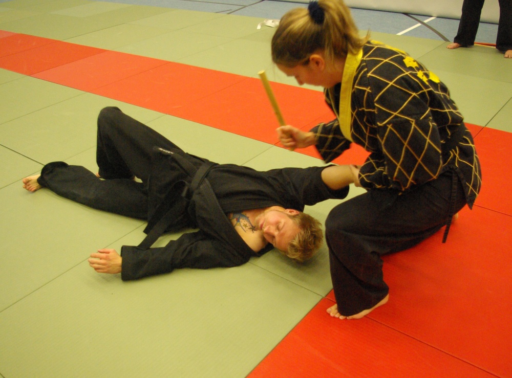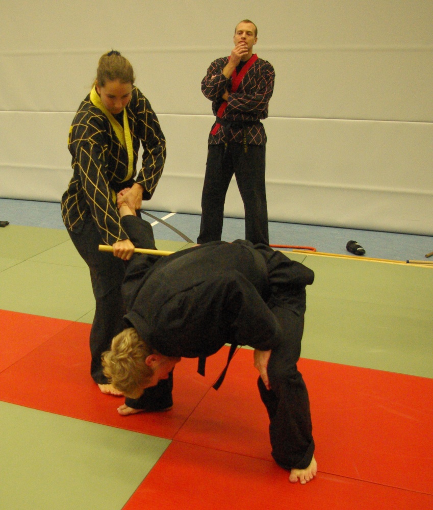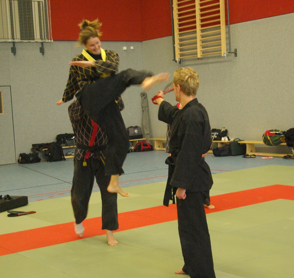 Da in der Nacht zum Sonntag die Uhren auf Winterzeit umgestellt wurden, hatten die Teilnehmer morgens eine Stunde mehr Ruhe, um sich auf den bevorstehenden Trainingstag vorzubereiten. Schwerpunkt waren an diesem Tage die Techniken für den jeweils angestrebten Dangrad. Die Begutachtung der gesprungenen Fußtechniken fiel recht zuversichtlich aus und bewies den bereits erworbenen guten Trainingsstand der Kandidaten. Bei den Handtechniken widmete sich Franz-Josef Wolf, speziell in den Messerabwehrtechniken, den Aspiranten für den ersten Dan. Hierbei wurde jede Technik noch einmal gründlich auseinandergelegt und ihre Prinzipien erläutert. Auch wenn manche Bewerber feststellen mussten, dass sie noch Verbesserungsbedarf hatten, war ja gerade dies Zielsetzung des Lehrgangs, Feinschliff zu bekommen, um die letzten Wochen bis zur Prüfung noch einmal optimiert trainieren zu können. Nicht zuletzt erhielten aber auch die Kandidaten für die anderen Dangrade wertvolle Tipps und fachmännische Hilfe für ihre Techniken.