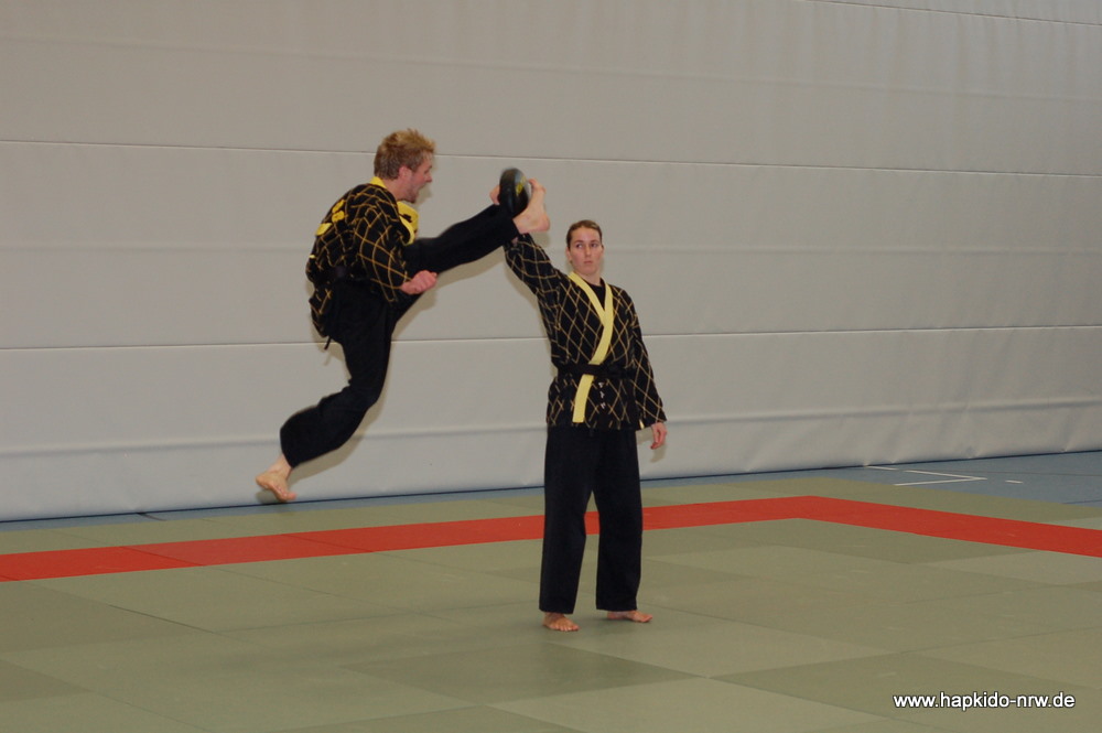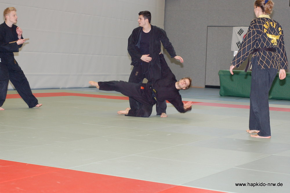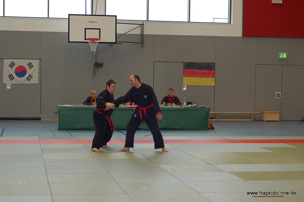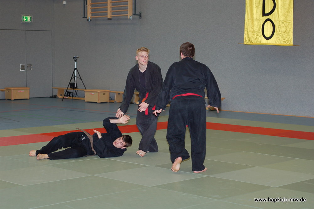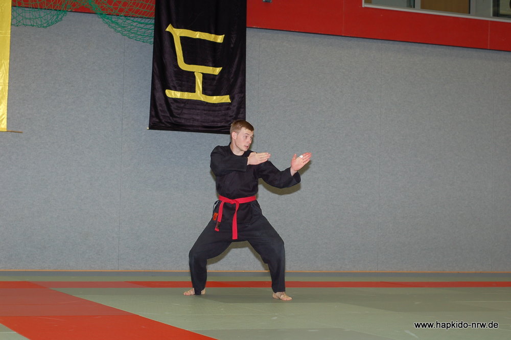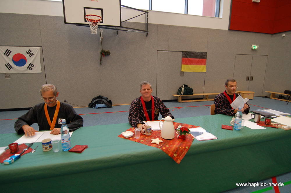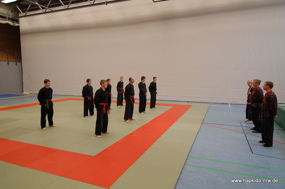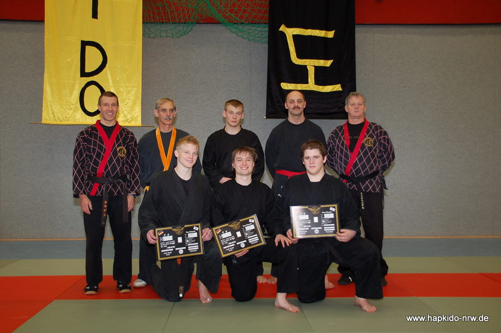 Im Dezember 2009 stellten sich 10 Hapkidoin den Dan-Prüfungskommissionen des NWHV, um die nächste Graduierungsstufe zu erreichen. Zu diesem Zweck hatte der Prüfungsbeauftragte für ein Wochenende nach Bönen eingeladen. Der ansässige Verein hatte seine neue Halle entsprechend vorbereitet und auch für ein der Veranstaltung angemessenes Ambiente gesorgt. Am Samstag stellten sich zunächst fünf Prüflinge aus den Vereinen Bönen, Clarholz und Schwerte der festgelegten Prüfungskommission F.-J. Wolf, 7. Dan IHC, J. Rath 5. Dan NWHV und D. Klos, um den ersten Dan zu erreichen. Am Sonntag folgten dann die Prüfungen zur Graduierung vom zweiten bis vierten Dan an. Dazu hatten sich ebenfalls fünf Kandidaten, hier aus den Vereinen Clarholz, Soest und Plettenberg angemeldet, um vor der Prüfungskommission, an diesem Tag zusammengesetzt mit F.-J. Wolf, 7. Dan IHC, G. Böse 5. Dan NWHV und D. Klos, ihre Leistungen unter Beweis zu stellen.