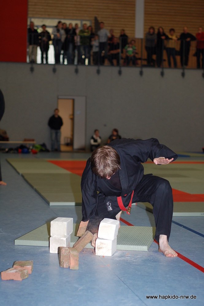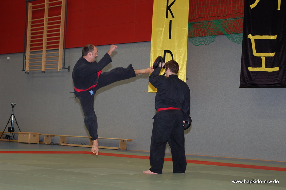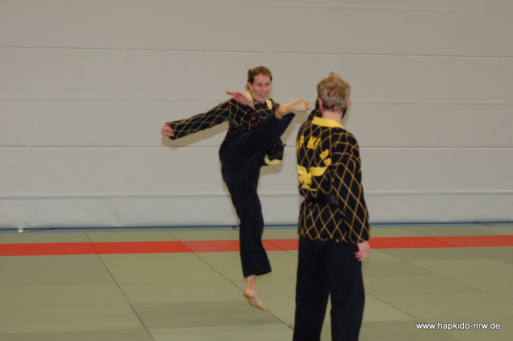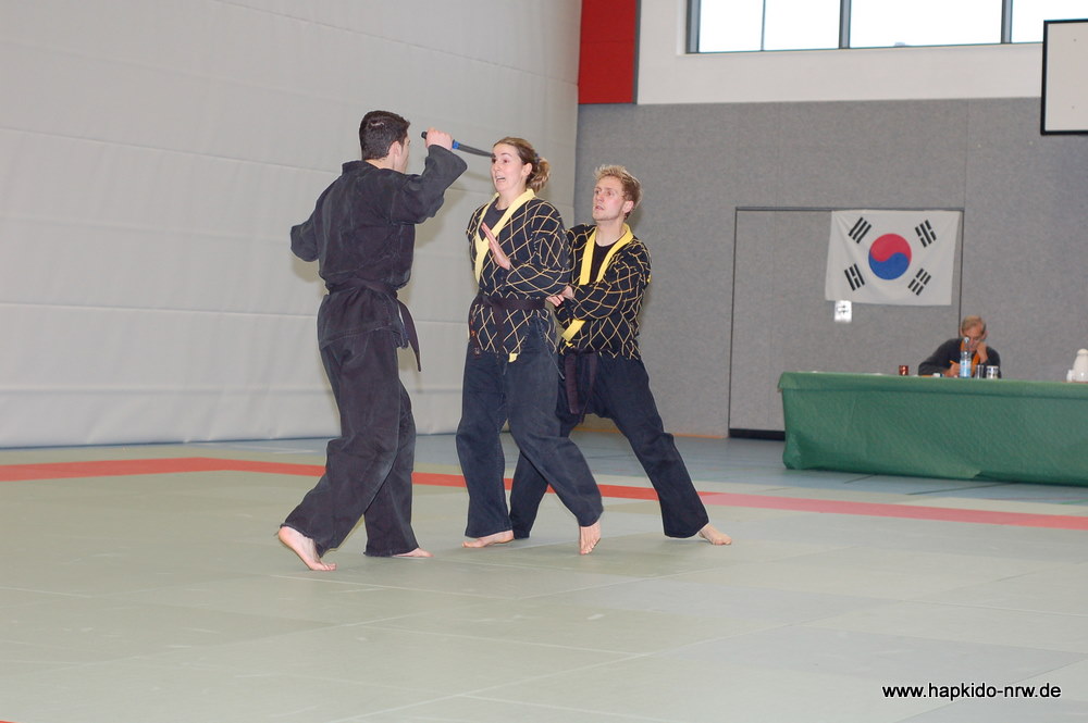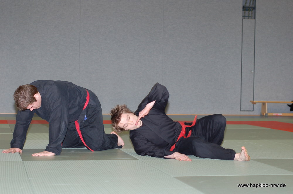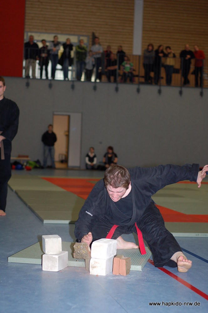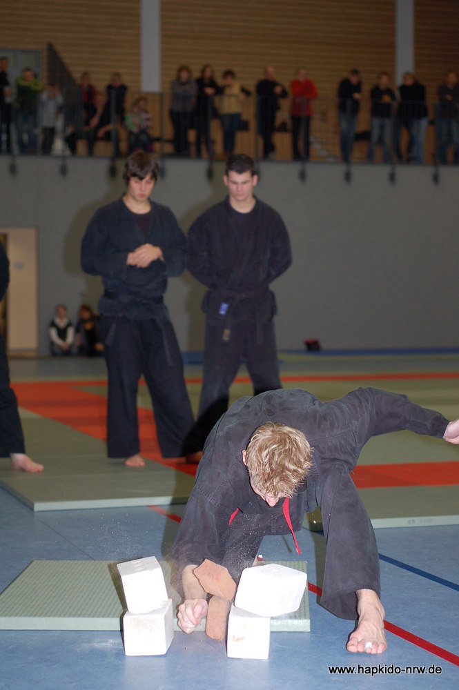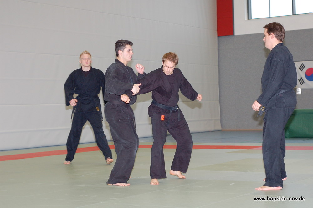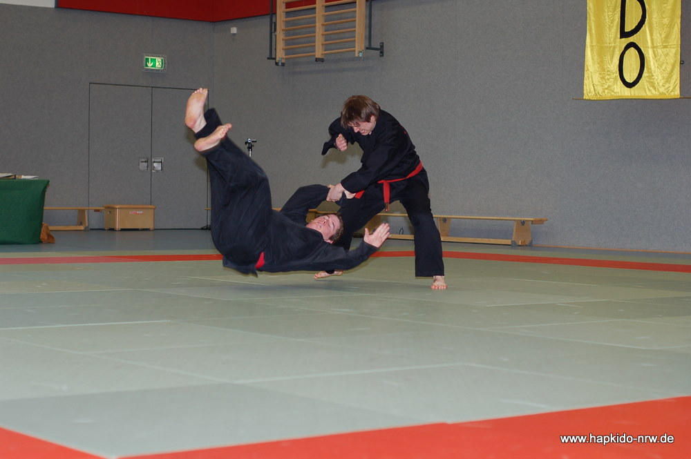Im Dezember 2009 stellten sich 10 Hapkidoin den Dan-Prüfungskommissionen des NWHV, um die nächste Graduierungsstufe zu erreichen. Zu diesem Zweck hatte der Prüfungsbeauftragte für ein Wochenende nach Bönen eingeladen. Der ansässige Verein hatte seine neue Halle entsprechend vorbereitet und auch für ein der Veranstaltung angemessenes Ambiente gesorgt. Am Samstag stellten sich zunächst fünf Prüflinge aus den Vereinen Bönen, Clarholz und Schwerte der festgelegten Prüfungskommission F.-J. Wolf, 7. Dan IHC, J. Rath 5. Dan NWHV und D. Klos, um den ersten Dan zu erreichen. Am Sonntag folgten dann die Prüfungen zur Graduierung vom zweiten bis vierten Dan an. Dazu hatten sich ebenfalls fünf Kandidaten, hier aus den Vereinen Clarholz, Soest und Plettenberg angemeldet, um vor der Prüfungskommission, an diesem Tag zusammengesetzt mit F.-J. Wolf, 7. Dan IHC, G. Böse 5. Dan NWHV und D. Klos, ihre Leistungen unter Beweis zu stellen.