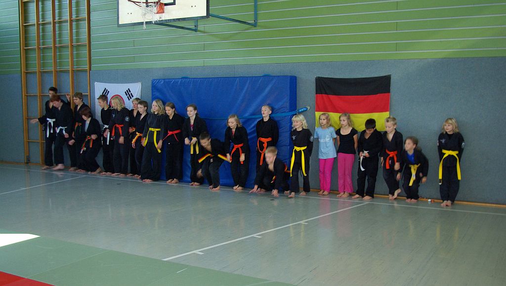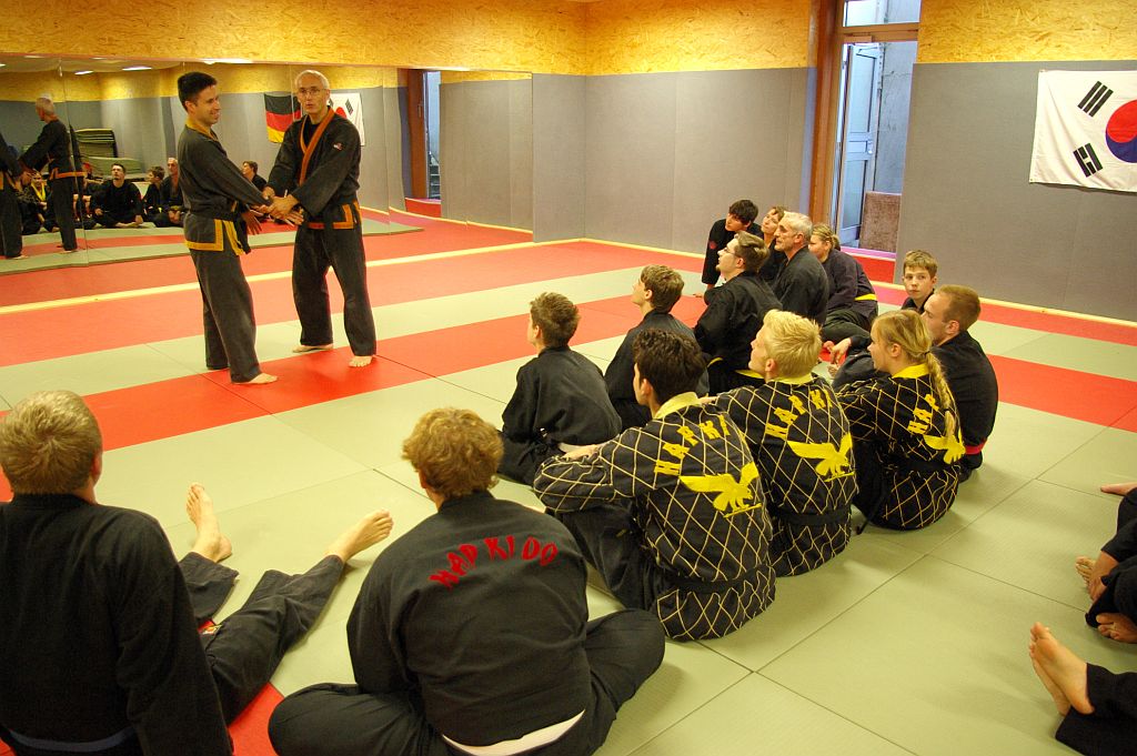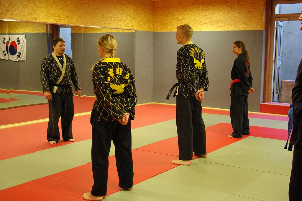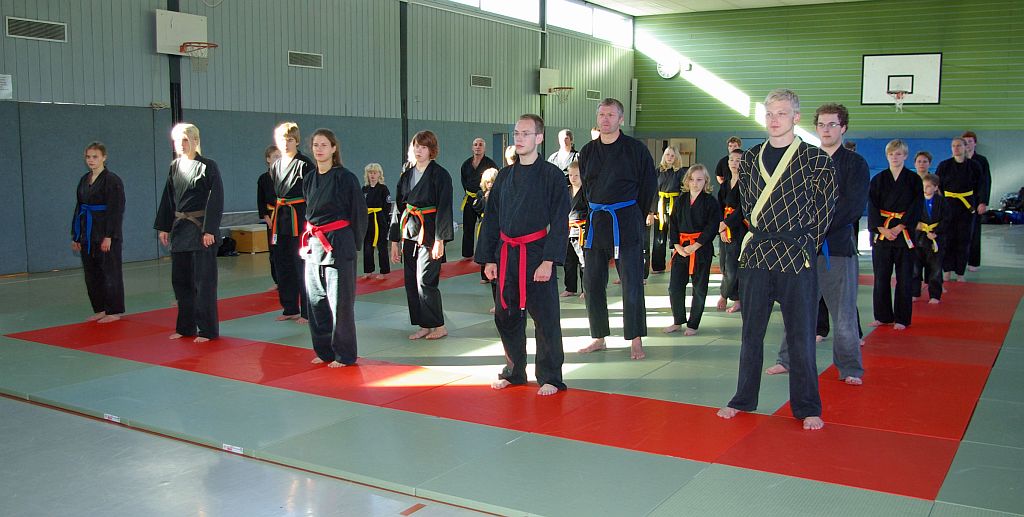 Das bewährte Konzept, einen Lehrgang für die NWHV-Jugend und die Erwachsenen zeitgleich an einem Ort durchzuführen, war auch 2012 wieder ein Erfolg. Für die Jugendlichen stellte sich dadurch nicht das Problem eine Mitfahrgelegenheit zu finden, weil man gemeinsam nach Plettenberg anreisen konnte, und es erwartete alle ein ereignisreiches, aber auch anstrengendes Wochenende. Nach der Begrüßung aller Teilnehmer durch den Lehrwart David Bruchholder und dem Jugendleiter Tobias Lohre trennten sich die Gruppen. Die Jugend blieb in der großen Turnhalle und die Senioren begaben sich mit David ins Untergeschoss, wo sie ein schöner Dojang mit Matten und Spiegelwand erwartete.