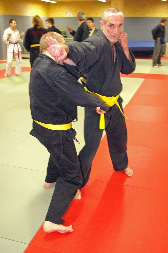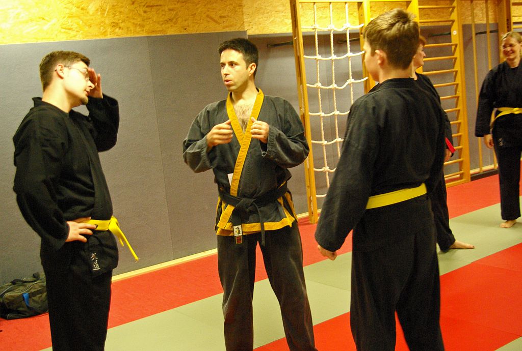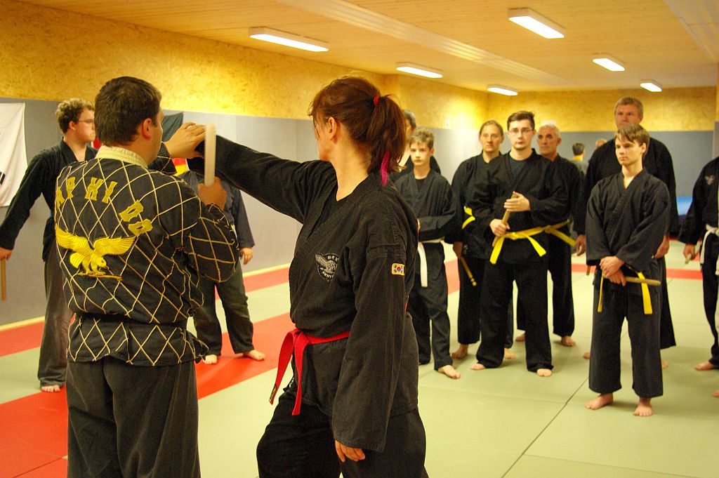 Das Unterrichtsprogramm war für beide Übungsgruppen altersgemäß vorbereitet. Während die Jugend sich mit sehr viel Spiel und Spaß bei ihren Themen Fallschule und Bewegungslehre im Stand und am Boden abreagierten, reichte das Programm der Ältereren an beiden Tagen von Stocktechniken über Armhebel bis zum Bodenkampf.