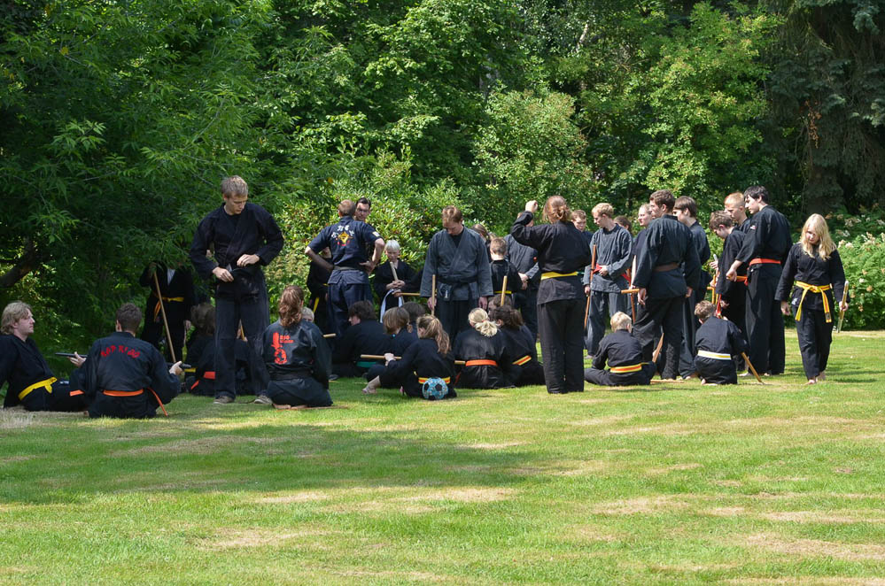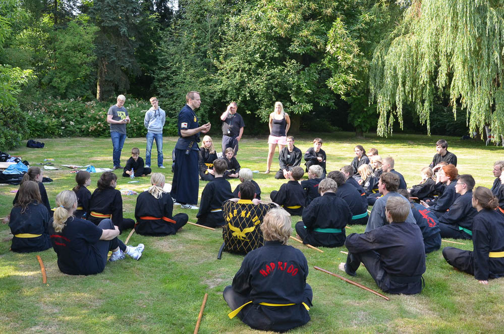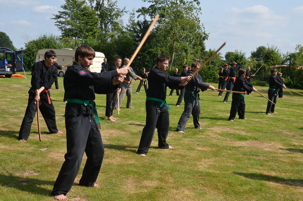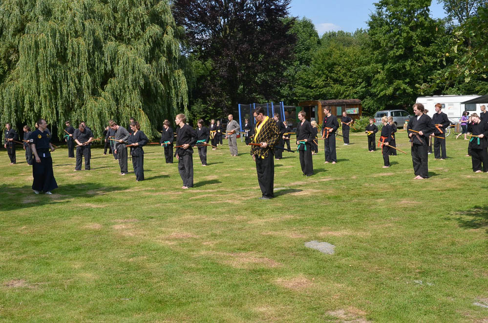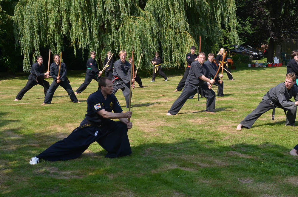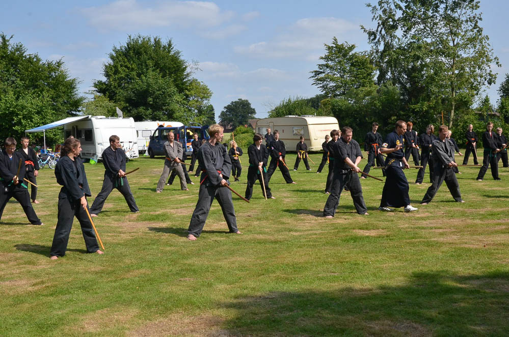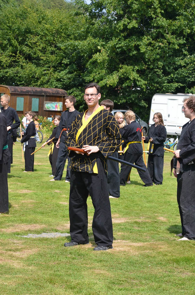Nach der Kanutour konnten sich alle noch mal kräftig mit den Überresten vom Vortag stärken. Dann ging es direkt zu der zweiten Trainingseinheit über. Die Verbandsjugend hatte den 1. Vorsitzende des NWHV e.V. Meister Guido Böse eingeladen, um den Teilnehmern die südkoreanische Schwertkampfkunst Haidong Gum Do näher zu bringen. Wieder einmal konnte Meister Böse sein enormes Wissen um die koreanischen Kampfkünste allen Teilnehmern interessant, spannend und mit viel Charme und Spaß vermitteln, so dass es alle, auch trotz der hitzigen Sonne, in den Bann zog und fleißig mittrainierten. Geschult wurden unter anderen Schnitttechniken und eine Abfolge von bestimmten Bewegungsabläufen, Zieh- und Wegstecktechniken, sowie weitere horizontale, vertikale und diagonale Schnitte.