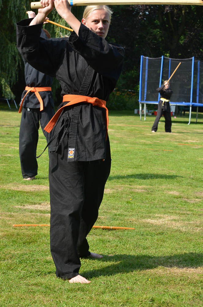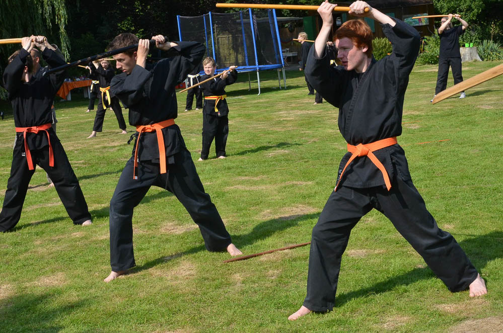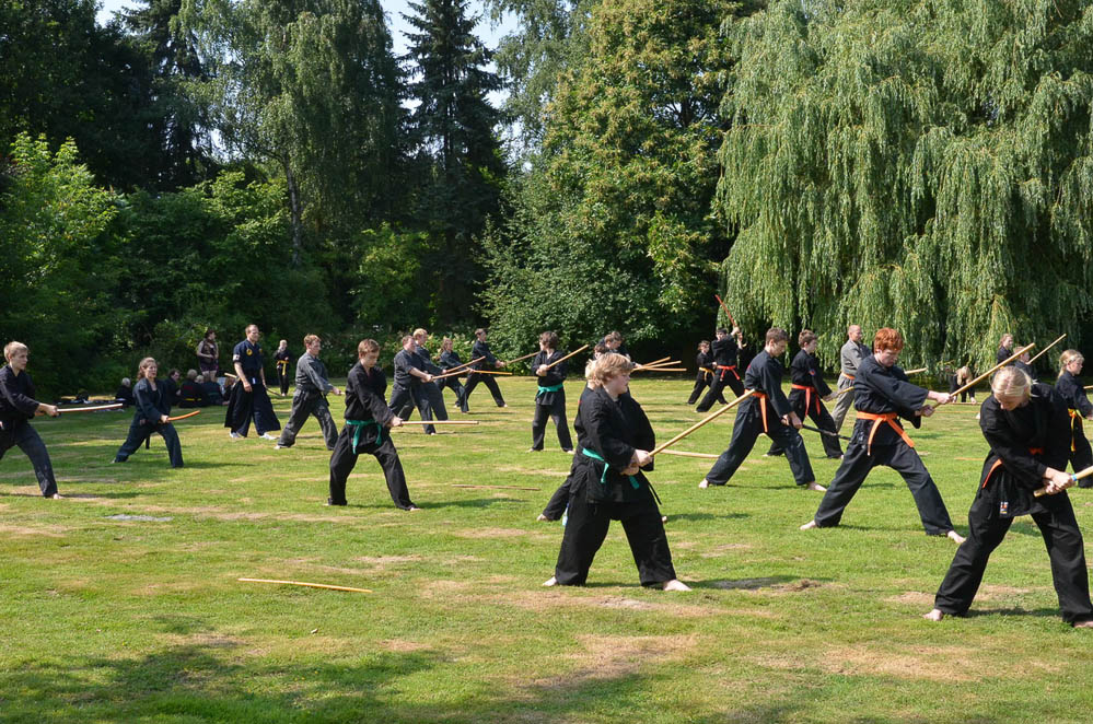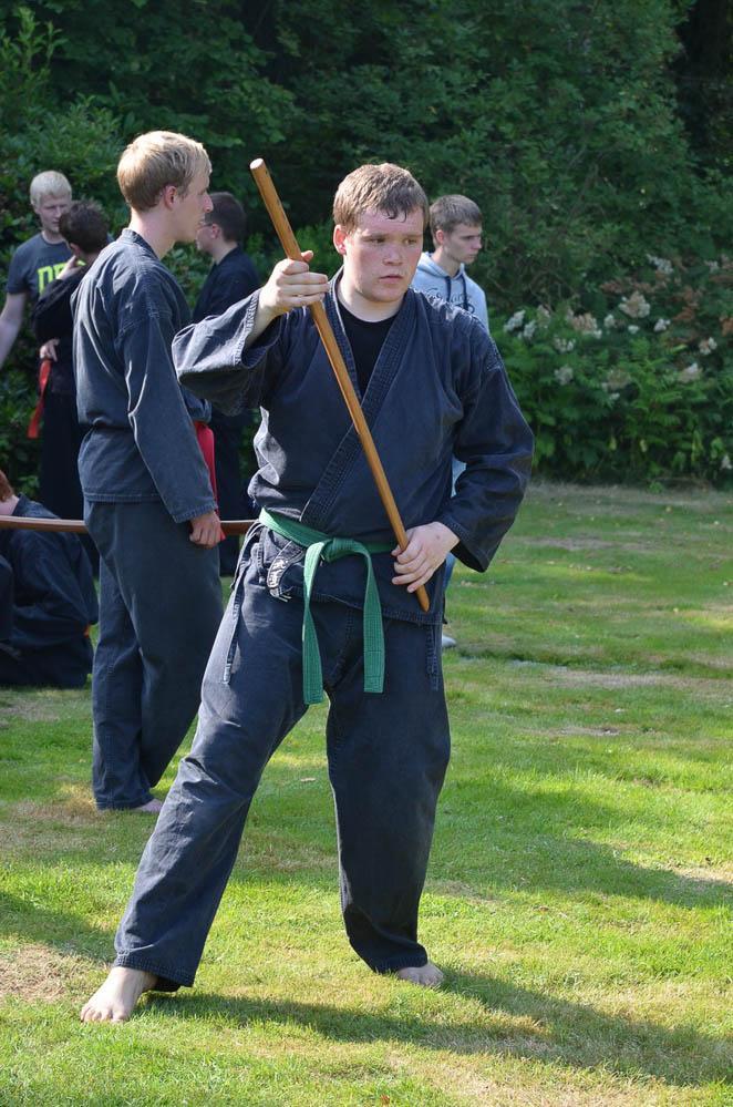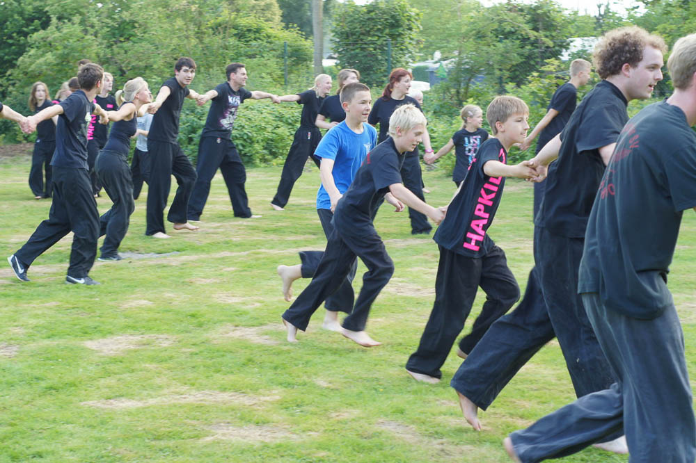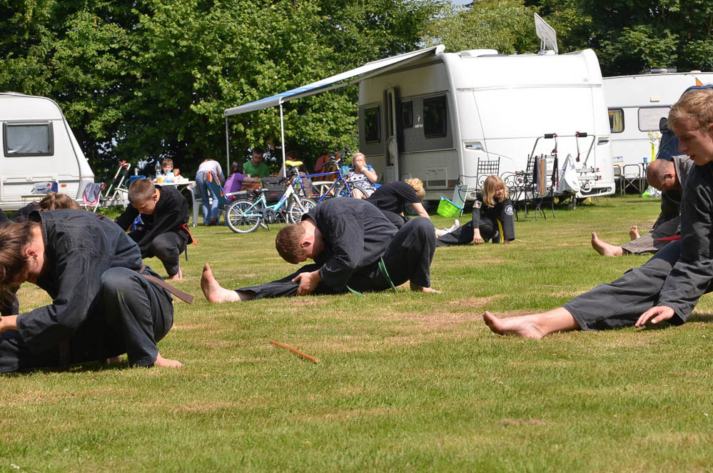 Nach der Kanutour konnten sich alle noch mal kräftig mit den Überresten vom Vortag stärken. Dann ging es direkt zu der zweiten Trainingseinheit über. Die Verbandsjugend hatte den 1. Vorsitzende des NWHV e.V. Meister Guido Böse eingeladen, um den Teilnehmern die südkoreanische Schwertkampfkunst Haidong Gum Do näher zu bringen. Wieder einmal konnte Meister Böse sein enormes Wissen um die koreanischen Kampfkünste allen Teilnehmern interessant, spannend und mit viel Charme und Spaß vermitteln, so dass es alle, auch trotz der hitzigen Sonne, in den Bann zog und fleißig mittrainierten. Geschult wurden unter anderen Schnitttechniken und eine Abfolge von bestimmten Bewegungsabläufen, Zieh- und Wegstecktechniken, sowie weitere horizontale, vertikale und diagonale Schnitte.