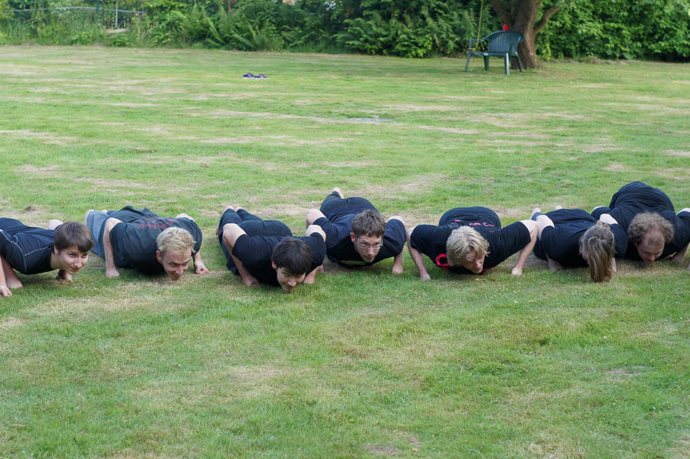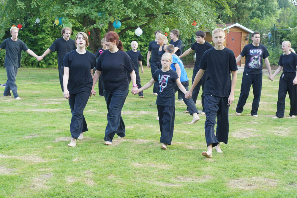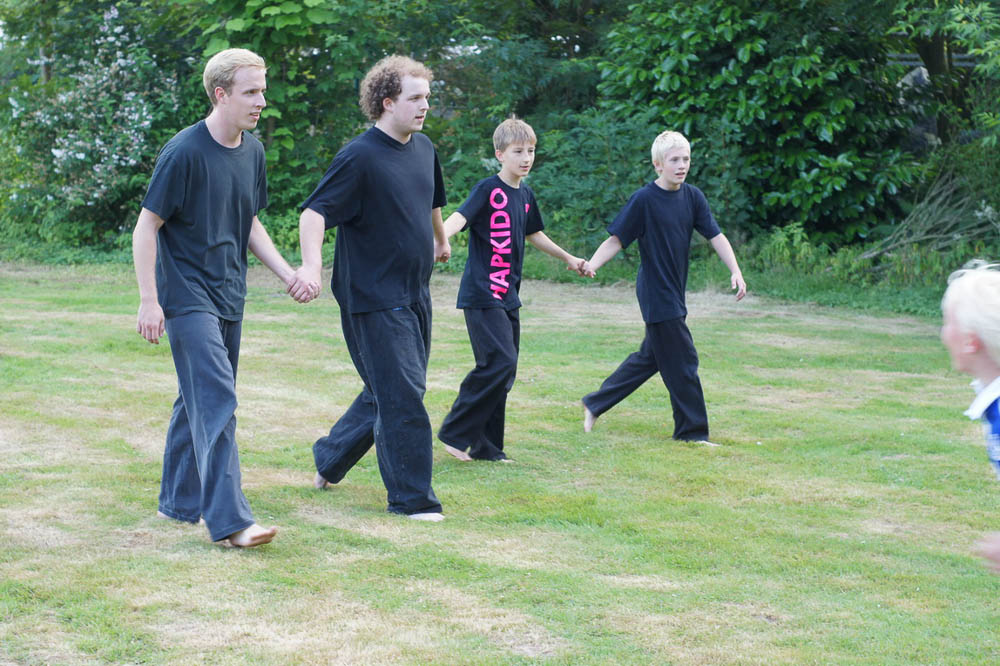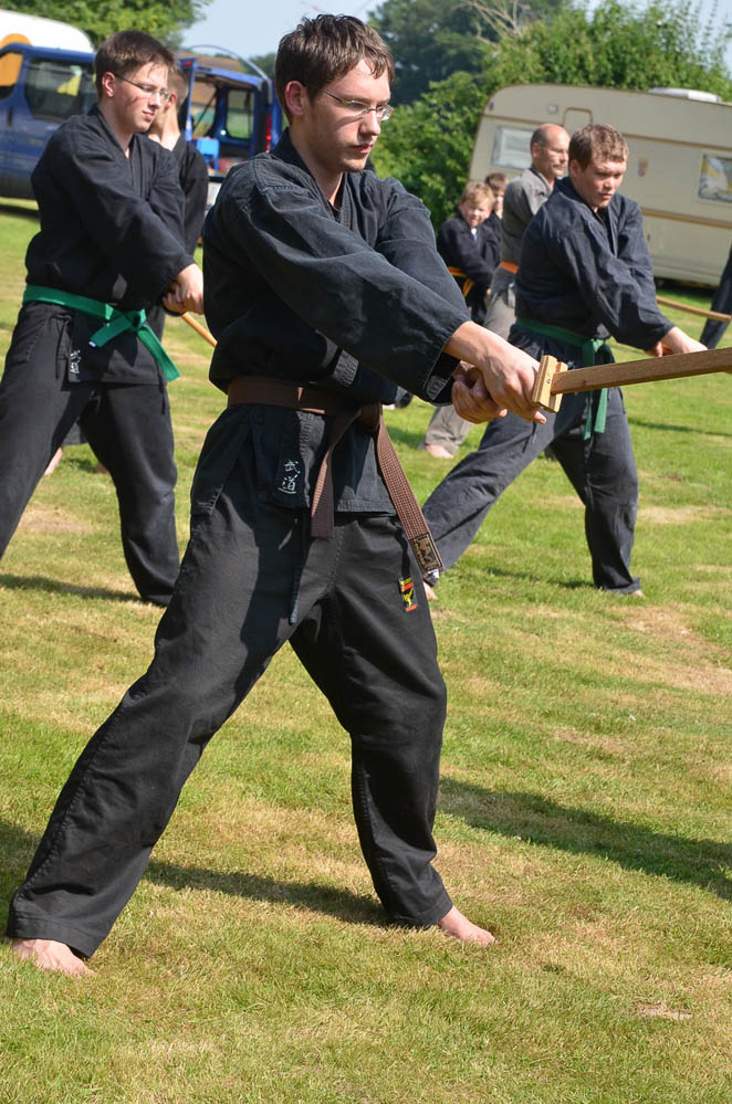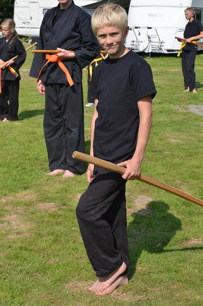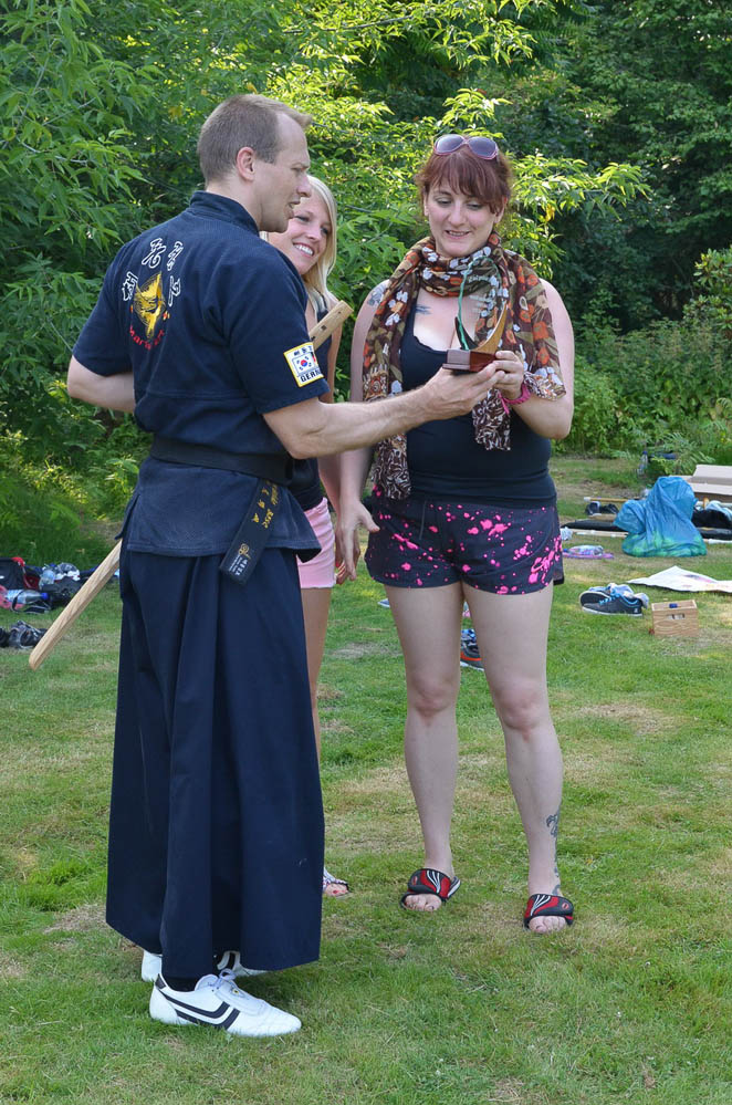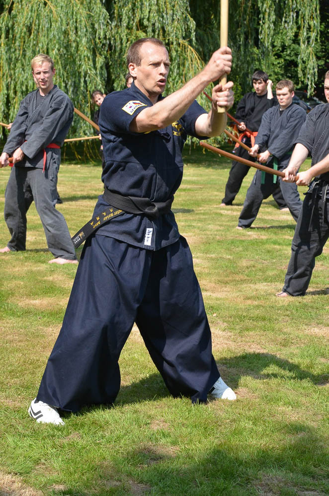 Nach der Kanutour konnten sich alle noch mal kräftig mit den Überresten vom Vortag stärken. Dann ging es direkt zu der zweiten Trainingseinheit über. Die Verbandsjugend hatte den 1. Vorsitzende des NWHV e.V. Meister Guido Böse eingeladen, um den Teilnehmern die südkoreanische Schwertkampfkunst Haidong Gum Do näher zu bringen. Wieder einmal konnte Meister Böse sein enormes Wissen um die koreanischen Kampfkünste allen Teilnehmern interessant, spannend und mit viel Charme und Spaß vermitteln, so dass es alle, auch trotz der hitzigen Sonne, in den Bann zog und fleißig mittrainierten. Geschult wurden unter anderen Schnitttechniken und eine Abfolge von bestimmten Bewegungsabläufen, Zieh- und Wegstecktechniken, sowie weitere horizontale, vertikale und diagonale Schnitte.