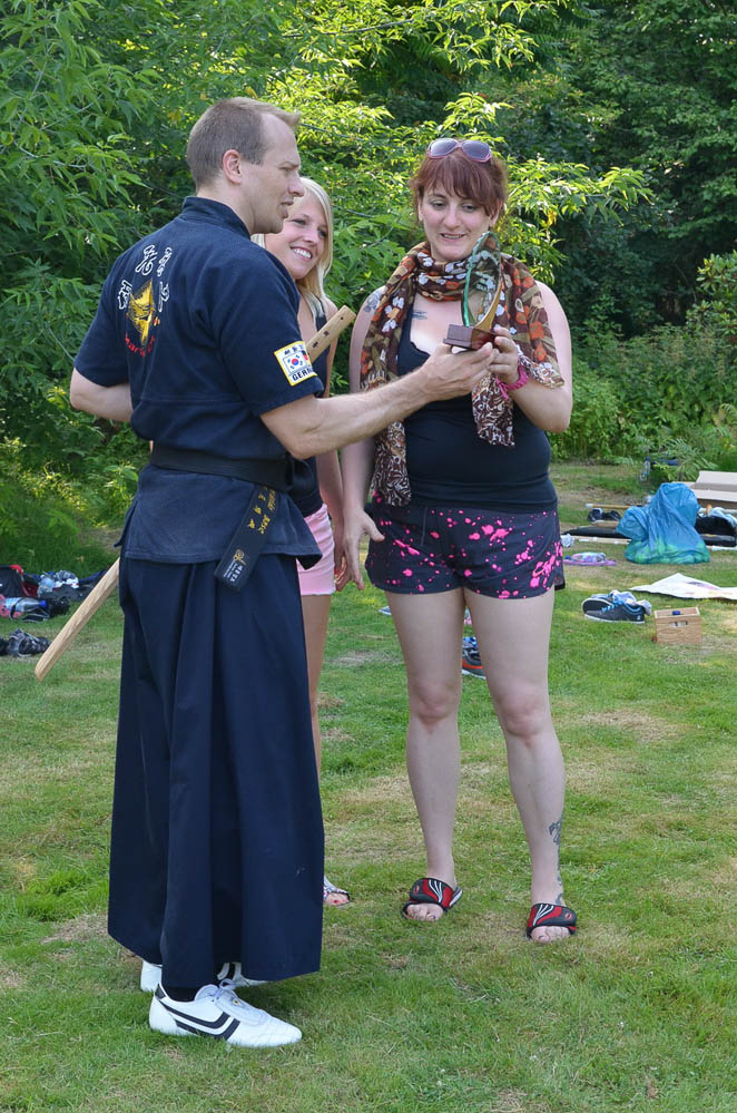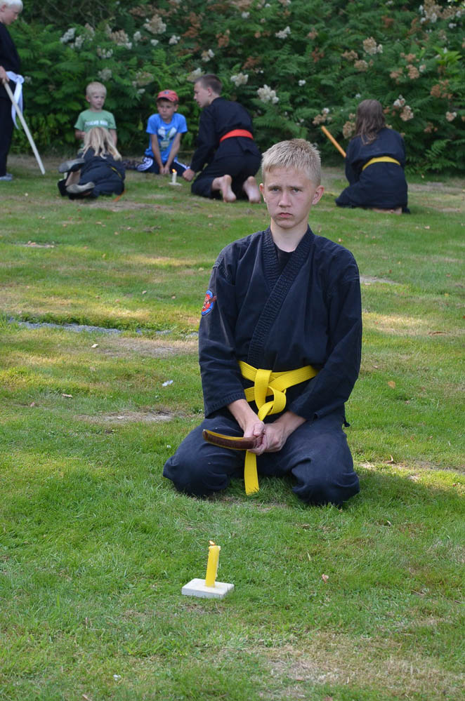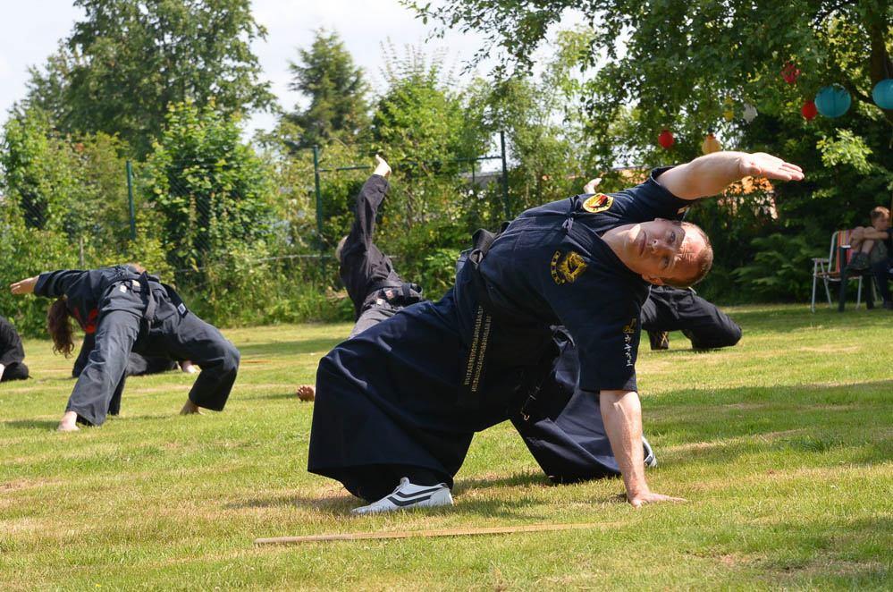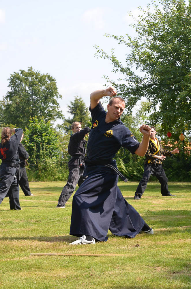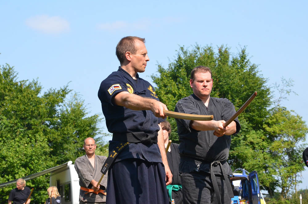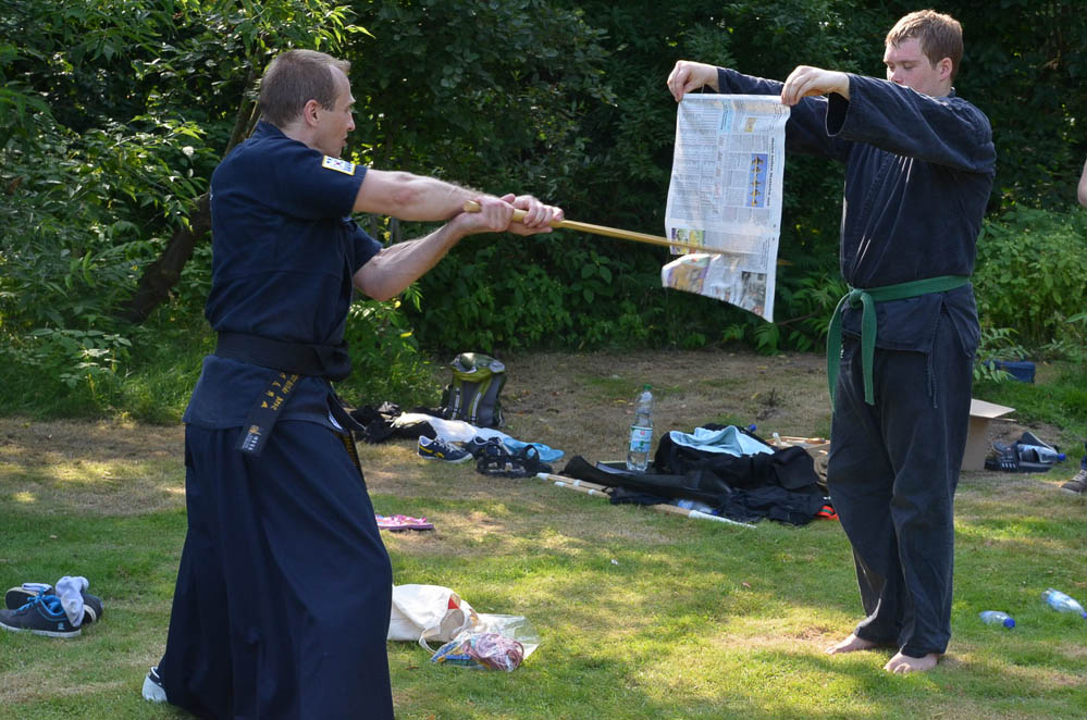 In eindrucksvoller Weise demonstrierte Meister Böse immer wieder worauf es genau ankommt und das er wieder einmal mehr sein Schwert meisterhaft beherrschen kann. Zum Schluss der Übungen wurden die Teilnehmer in Gruppen aufgeteilt. An den einzelnen Stationen konnten sie sich nun erproben und den Versuch starten z. B. eine brennende Kerze zu löschen, Zeitungspapier, welches ein einer Wäscheleine hing, zu zerteilen oder gar hochgeworfene Tennisbälle mit dem Holzschwert zu schneiden. Ein gelungener und prägsamer Techniklehrgang, den die Teilnehmer noch lange in Erinnerung behalten werden.