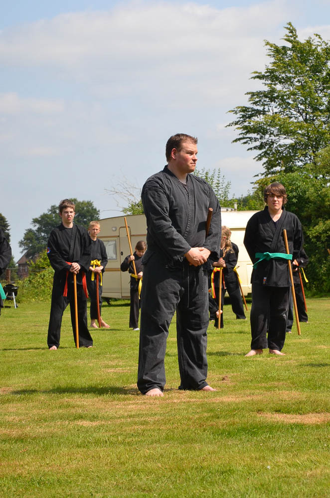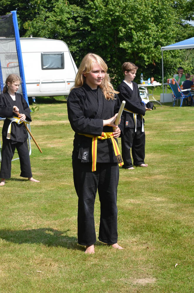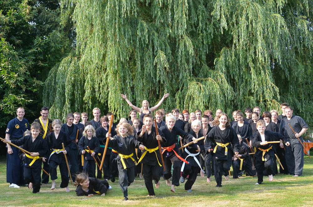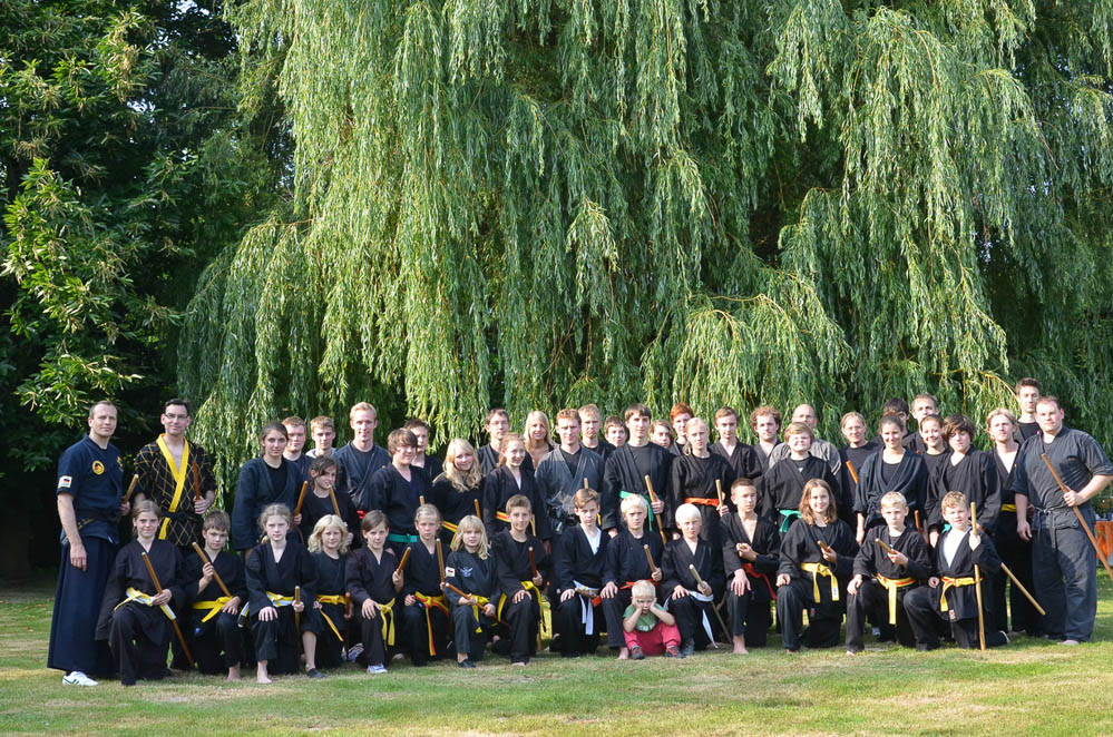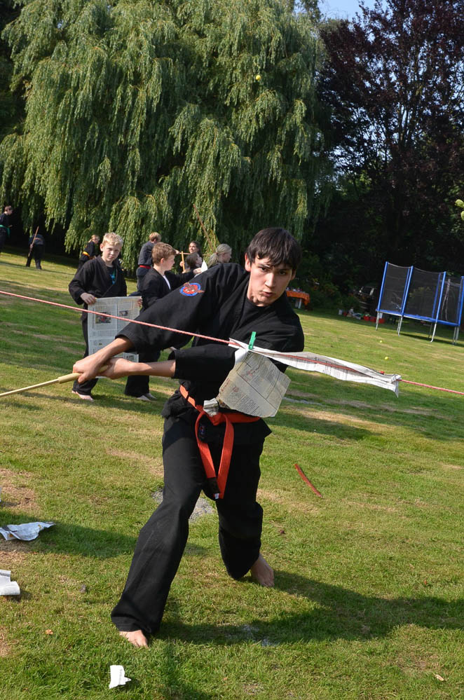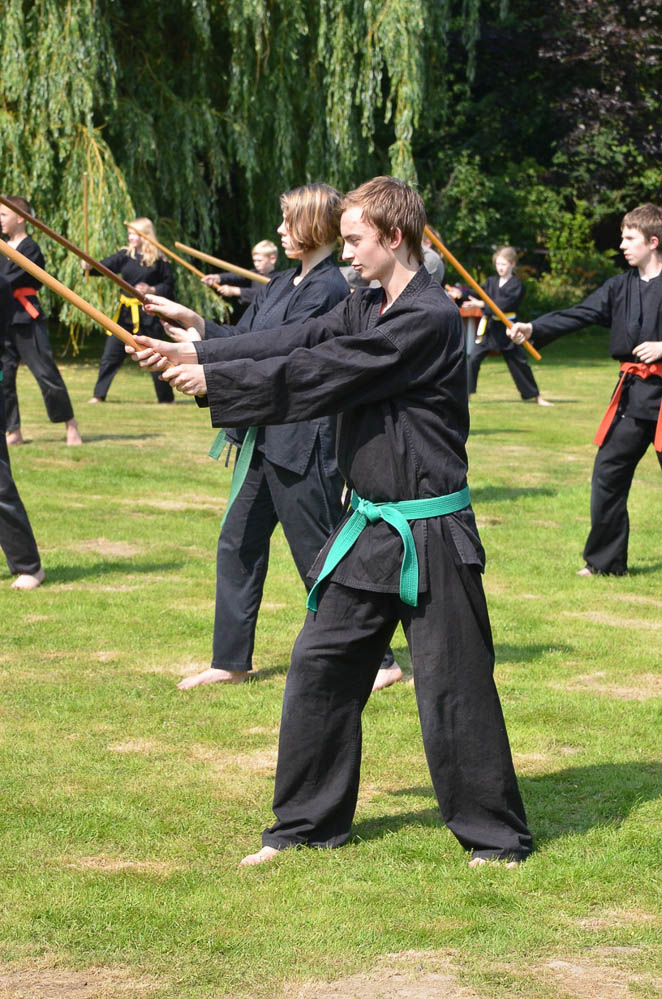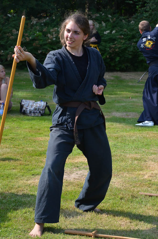 In eindrucksvoller Weise demonstrierte Meister Böse immer wieder worauf es genau ankommt und das er wieder einmal mehr sein Schwert meisterhaft beherrschen kann. Zum Schluss der Übungen wurden die Teilnehmer in Gruppen aufgeteilt. An den einzelnen Stationen konnten sie sich nun erproben und den Versuch starten z. B. eine brennende Kerze zu löschen, Zeitungspapier, welches ein einer Wäscheleine hing, zu zerteilen oder gar hochgeworfene Tennisbälle mit dem Holzschwert zu schneiden. Ein gelungener und prägsamer Techniklehrgang, den die Teilnehmer noch lange in Erinnerung behalten werden.