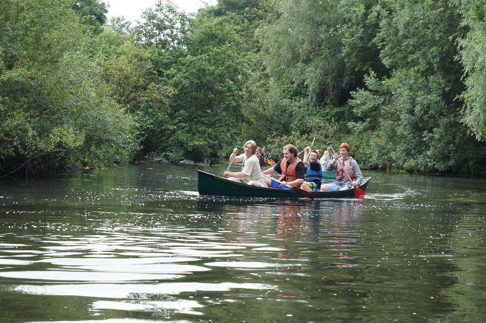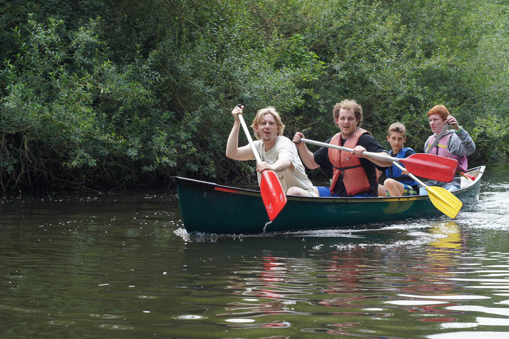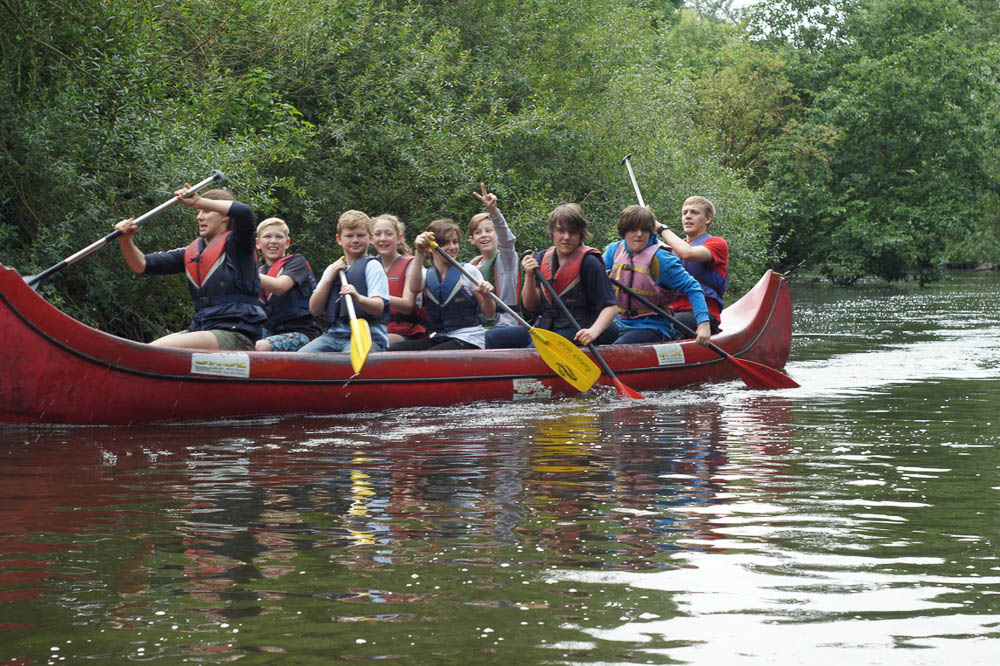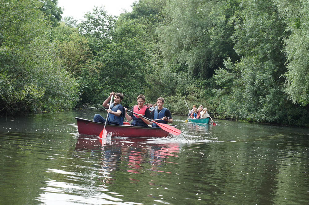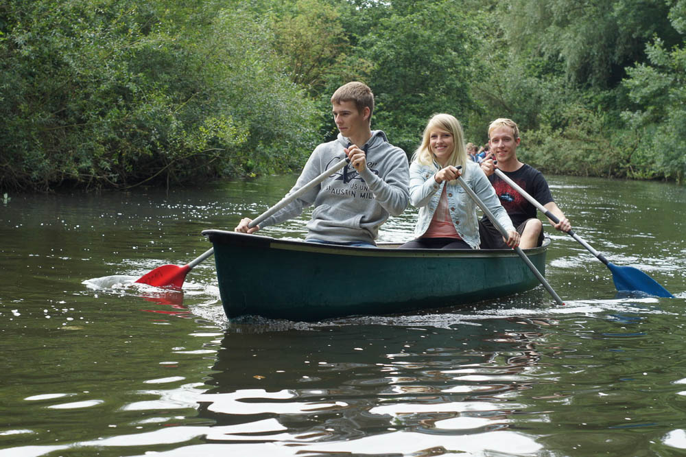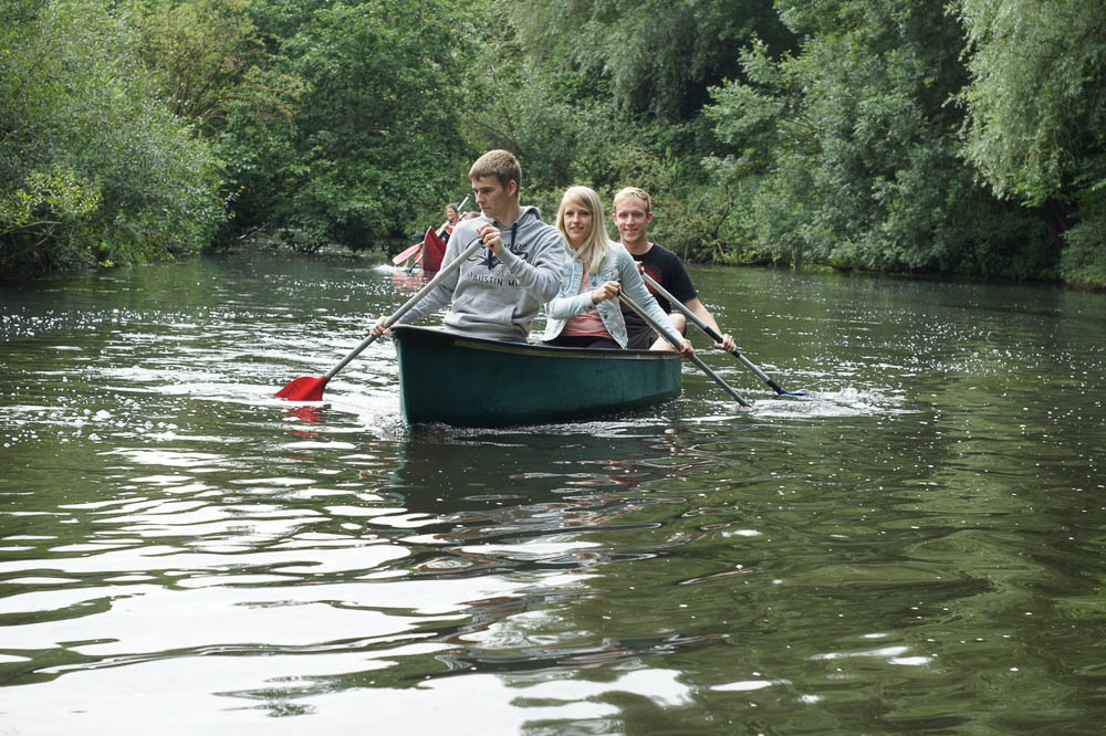 In der Früh wurden wir von der Sonne, die sich im morgendlichen Tau auf der Grasnarbe spiegelte, geweckt - ein herrlicher Tagesbeginn. Bei einem gemeinsamen Frühstück und frischen Brötchen stärkten wir uns. An diesem Tag machte die Gruppe einen Ausflug zur Pleister Mühle, um dort die Kanus zu Wasser zu lassen. Dort angekommen wurden wir sehr herzlich von den Mitarbeitern des Teams Rucksack empfangen. Nach einer kurzen Einweisung und Ausstattung mit Schwimmwesten und Paddel wurden wir in die freie Natur losgelassen. In den uns zur Verfügung gestellten 3er, 4er und 10er Kanus konnte jeder nach Belieben paddeln und die schöne Landschaft genießen, die geprägt war von vielen Gartenhäuschen, pompösen Anwesen mit diversen Steganlagen, sowie vielen Anglern, die an diesem Tag, aufgrund unseren Schlachtrufen, wohl wenig gefangen haben. Einige von ihnen waren so aktiv, dass sie es bis zum Wehr schafften, dann aber wieder umdrehen mussten, da die Ablegestelle auch unsere Anlegestelle war. Hatte man das im Eifer des Gefechts den Vorausfahrenden vergessen zu sagen, waren hinterher doch alle wohlauf und konnten stolz sagen, dass sie es am Weitesten von allen geschafft hatten.