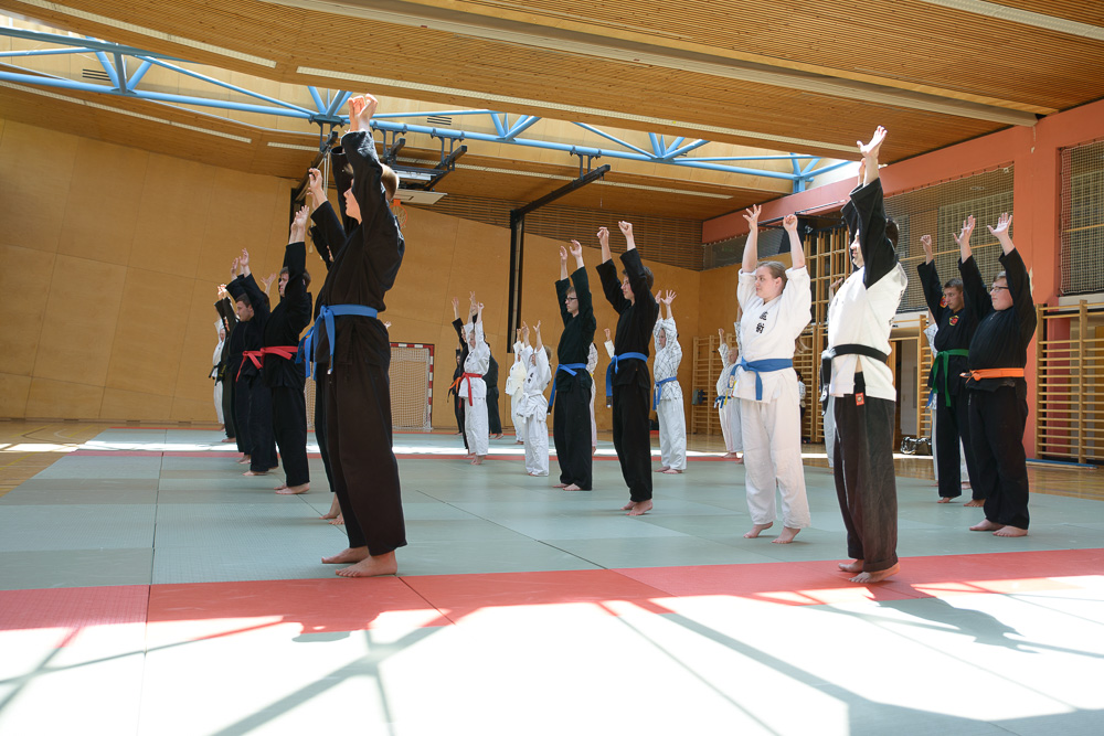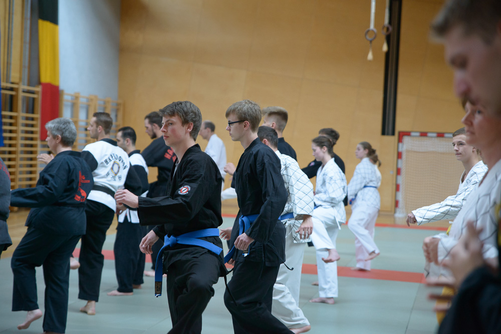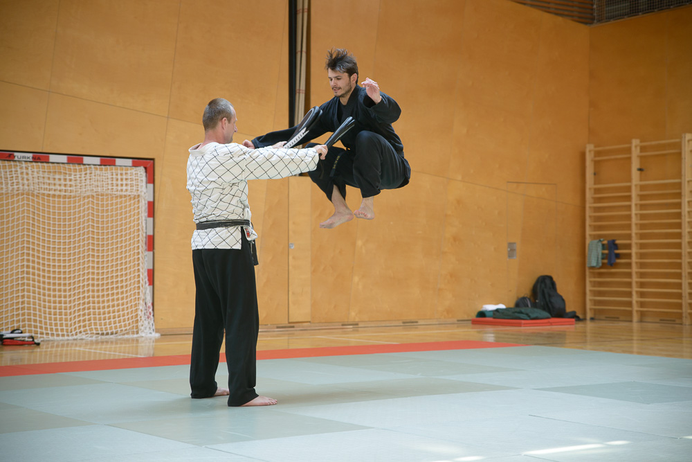 Besonders schwierige Sprungfußtechniken wurden unter der Leitung von Manfred Salmhofer erarbeitet. Hoch abspringen, an der Wand weiterlaufen und im Sprung in eine Pratze treten brachten den Danträgern einen besonderen Spaß und stellte manchen Farbgurt vor eine ganz neue Herausforderung.