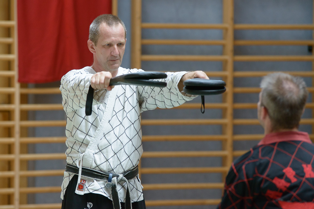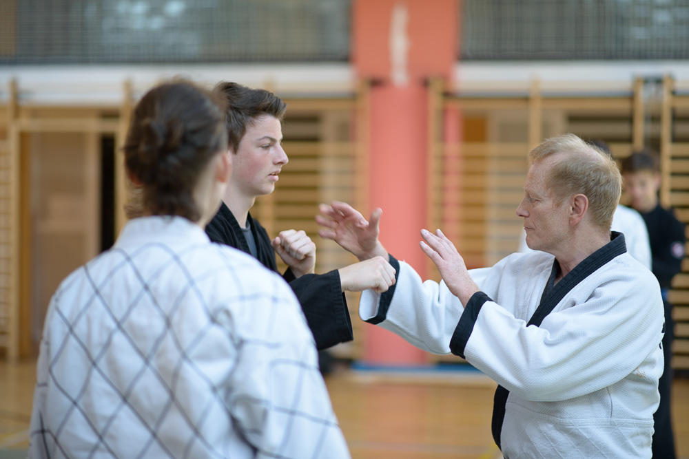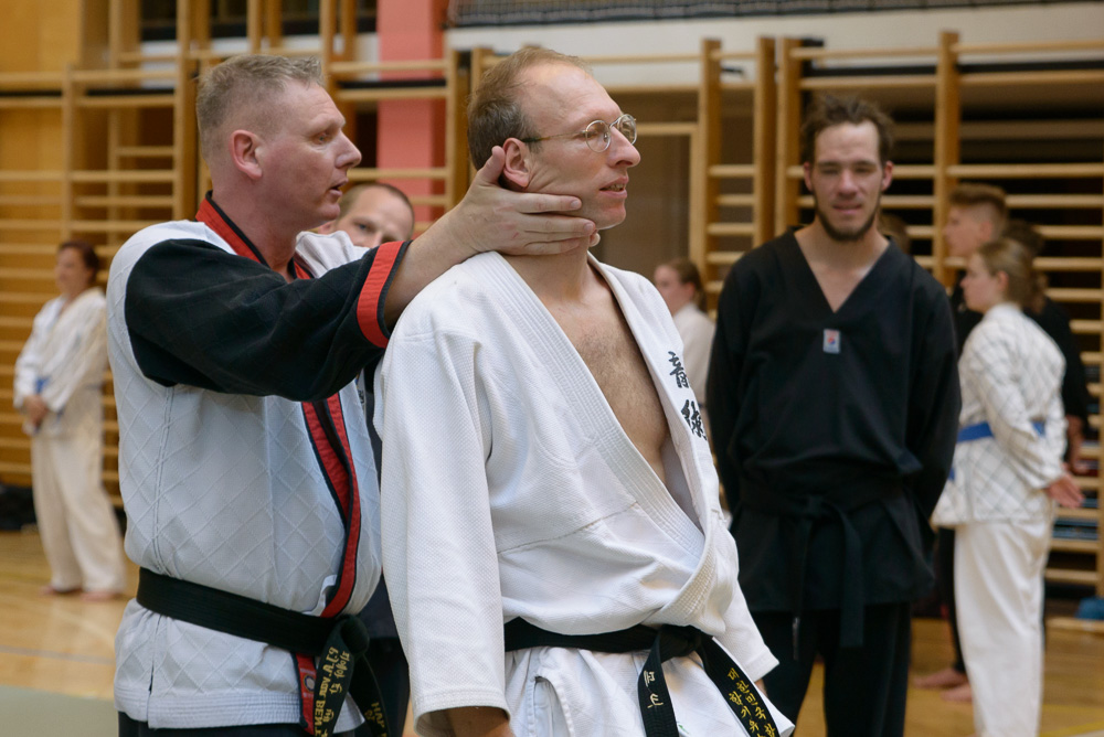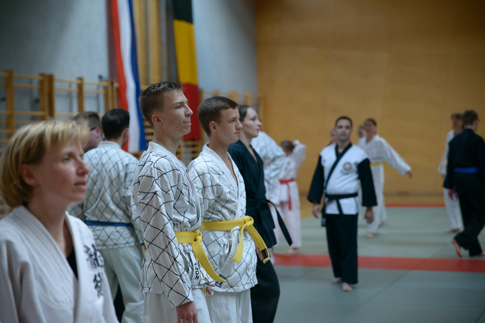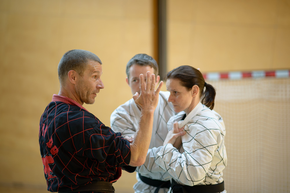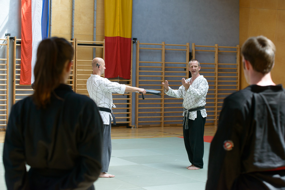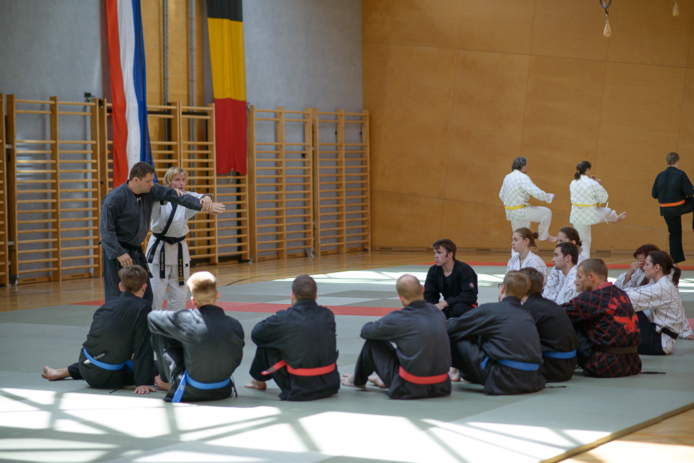 Trotz unterschiedlicher Nationalität, Stilrichtung und Sprache der Referenten bauten die Trainingseinheiten immer wieder aufeinander auf und ergänzen sich gegenseitig. Um das Thema Kleiderfassen und die entsprechenden Abwehrtechniken ging es in den Einheiten, die von Jürgen Rath referiert wurden. Weitergeleitet wurde dies von den beiden niederländischen Referenten Martin Zingel und Pierre van Bentum, sie zeigten Techniken zur Kraftausnutzung.