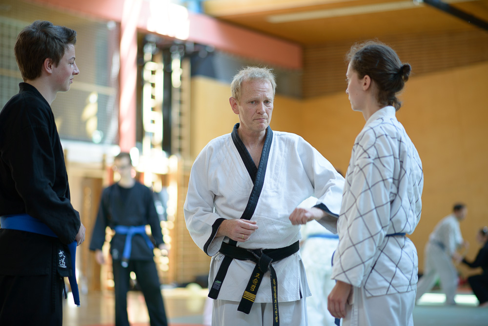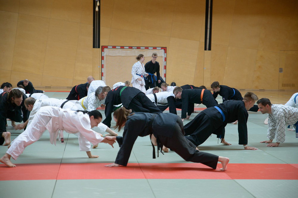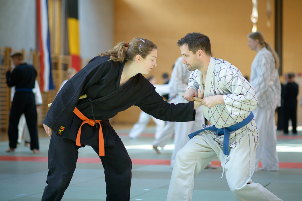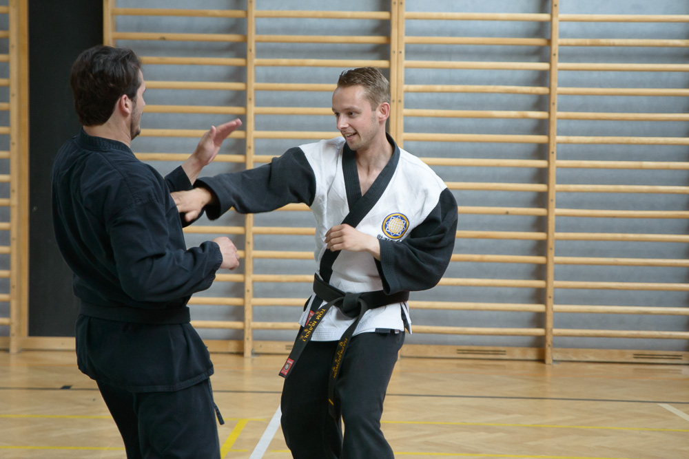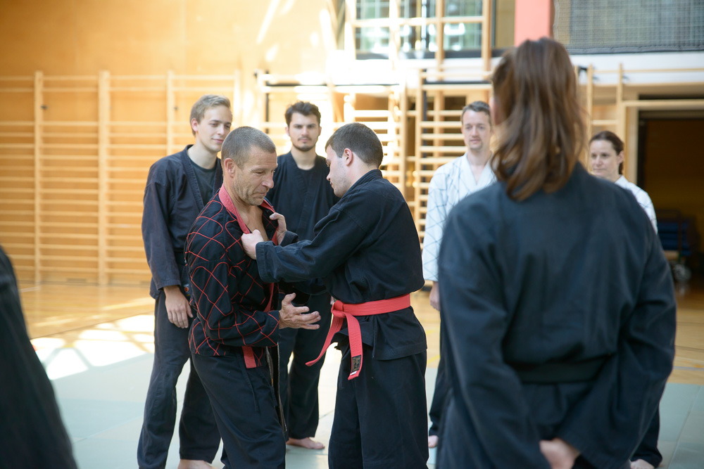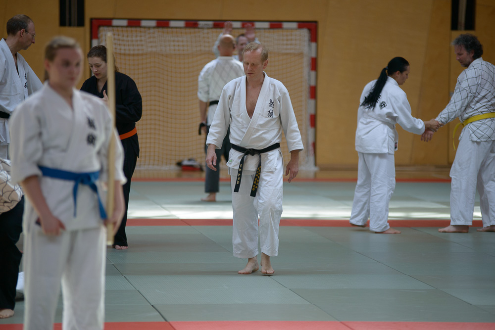 Trotz unterschiedlicher Nationalität, Stilrichtung und Sprache der Referenten bauten die Trainingseinheiten immer wieder aufeinander auf und ergänzen sich gegenseitig. Um das Thema Kleiderfassen und die entsprechenden Abwehrtechniken ging es in den Einheiten, die von Jürgen Rath referiert wurden. Weitergeleitet wurde dies von den beiden niederländischen Referenten Martin Zingel und Pierre van Bentum, sie zeigten Techniken zur Kraftausnutzung.