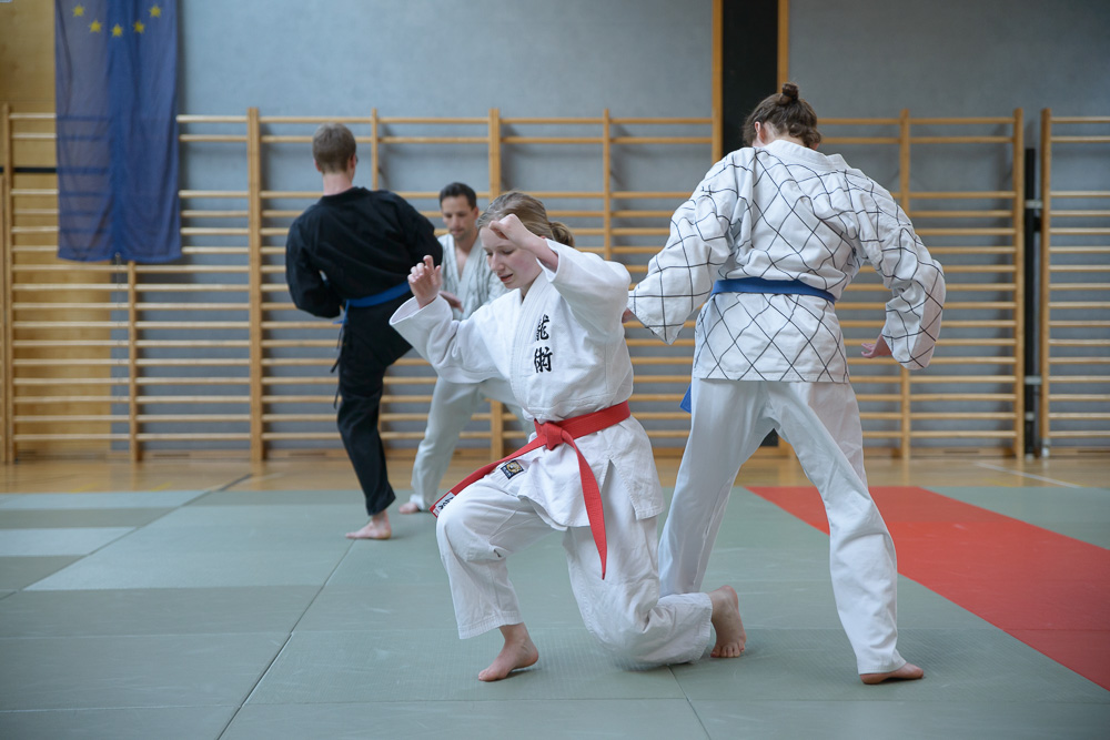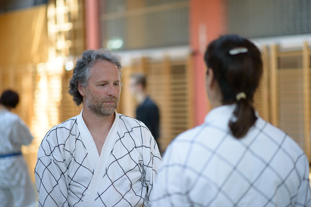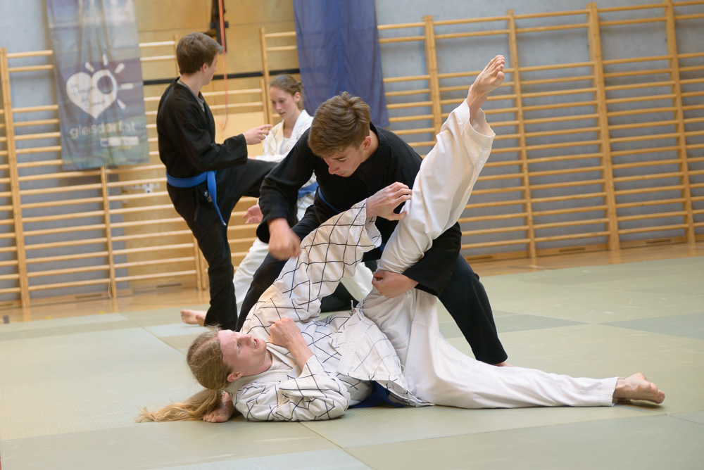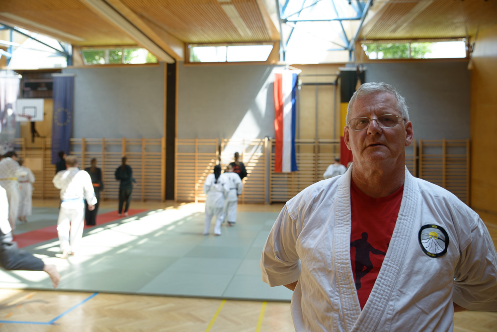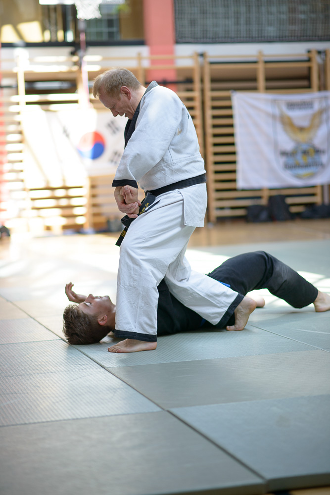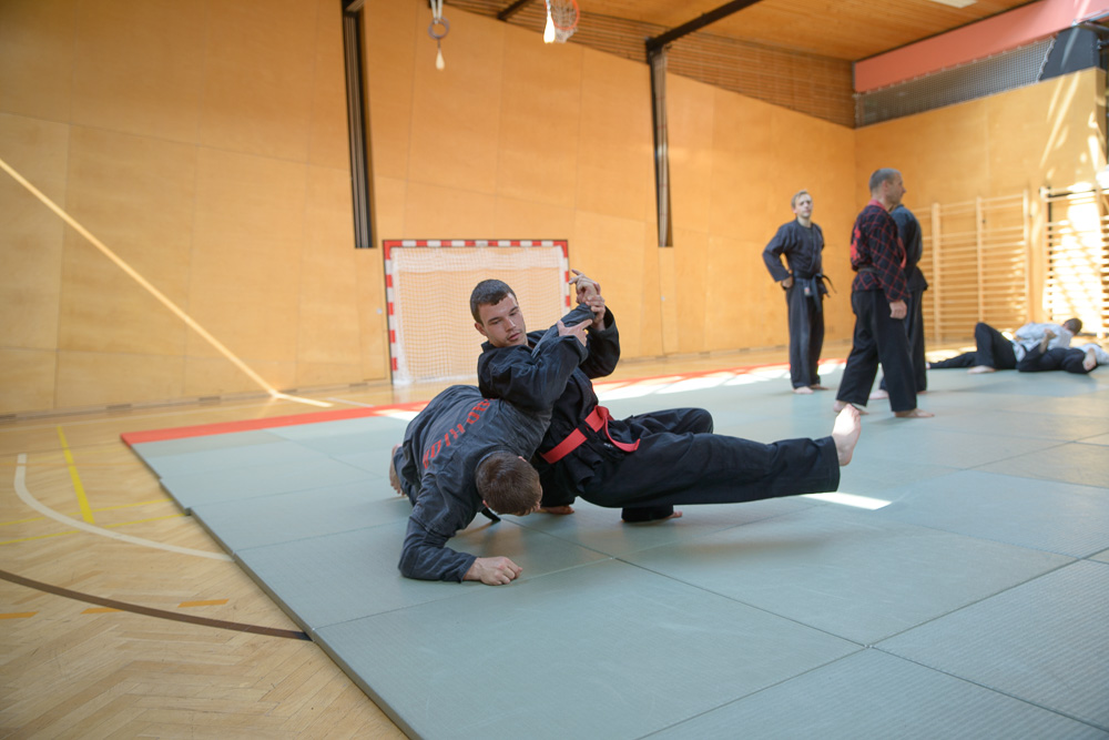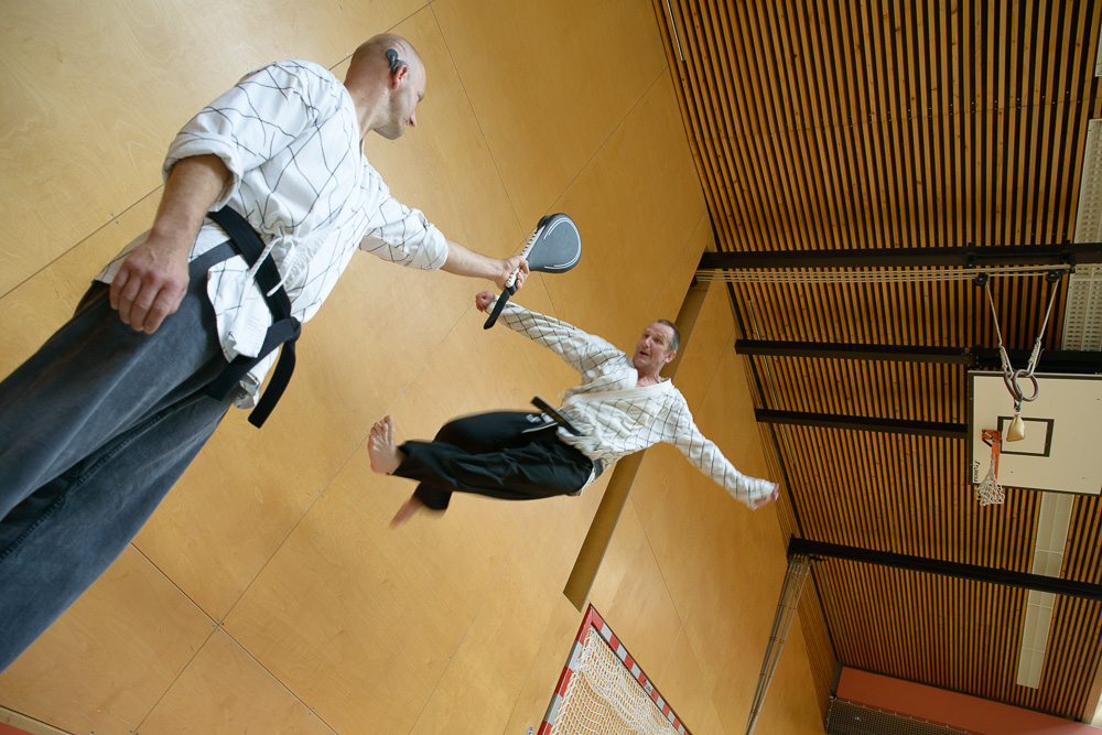 Trotz unterschiedlicher Nationalität, Stilrichtung und Sprache der Referenten bauten die Trainingseinheiten immer wieder aufeinander auf und ergänzen sich gegenseitig. Um das Thema Kleiderfassen und die entsprechenden Abwehrtechniken ging es in den Einheiten, die von Jürgen Rath referiert wurden. Weitergeleitet wurde dies von den beiden niederländischen Referenten Martin Zingel und Pierre van Bentum, sie zeigten Techniken zur Kraftausnutzung.