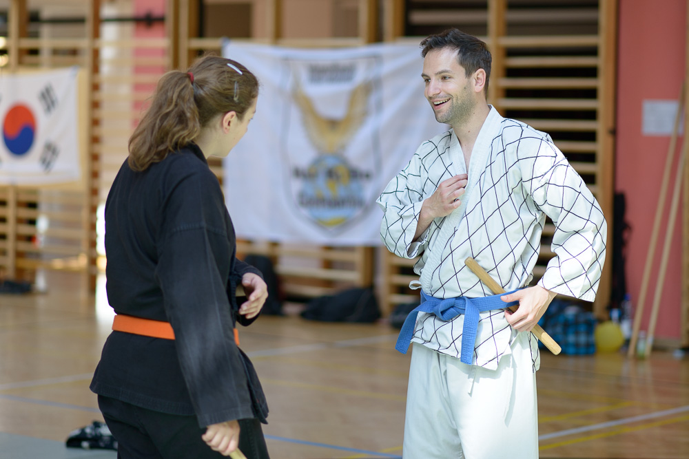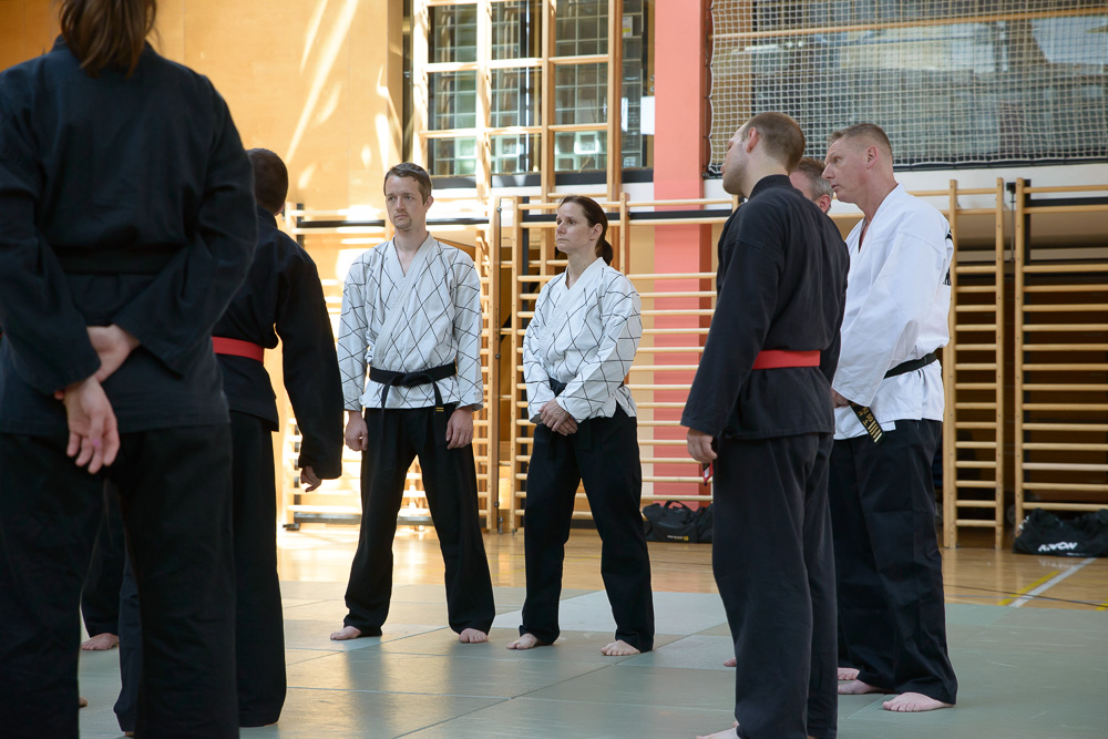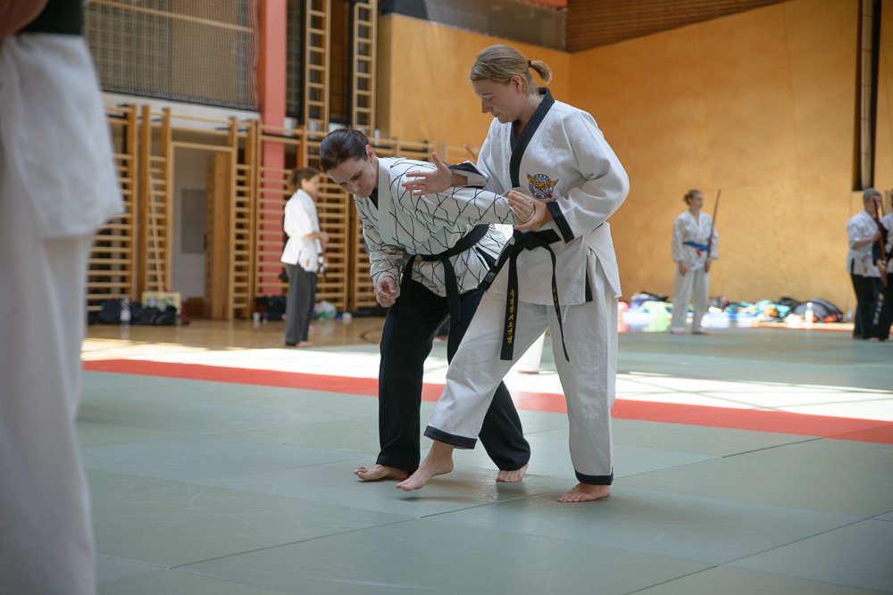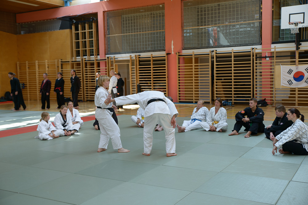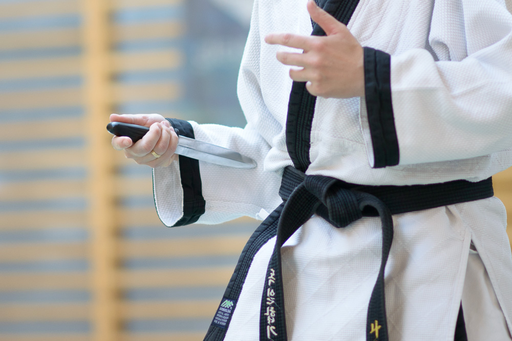 Volker Gössling zeigte ursprüngliche, geradlinige Hapkido Techniken, seine Ehefrau Nadine begeisterte ihre Zuhörer mit einer fundierten Trainingseinheit zur Messerabwehr, die so manch einem die Augen zur besonderen Gefährlichkeit einer solchen Waffe geöffnet hat.