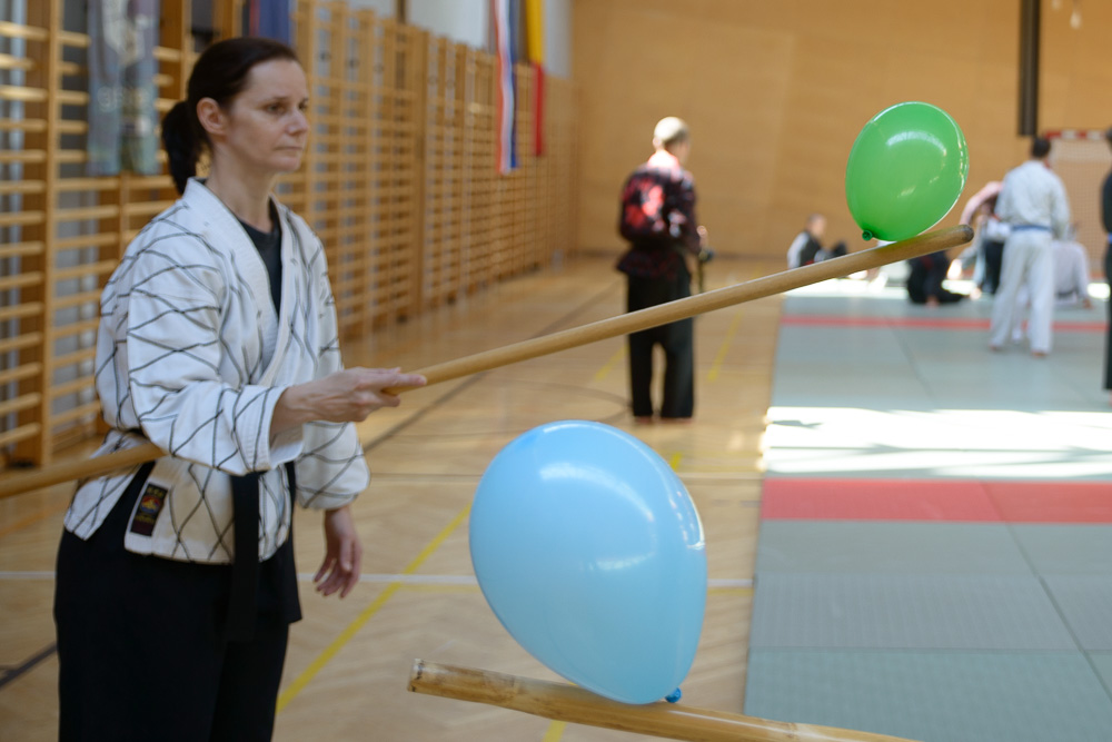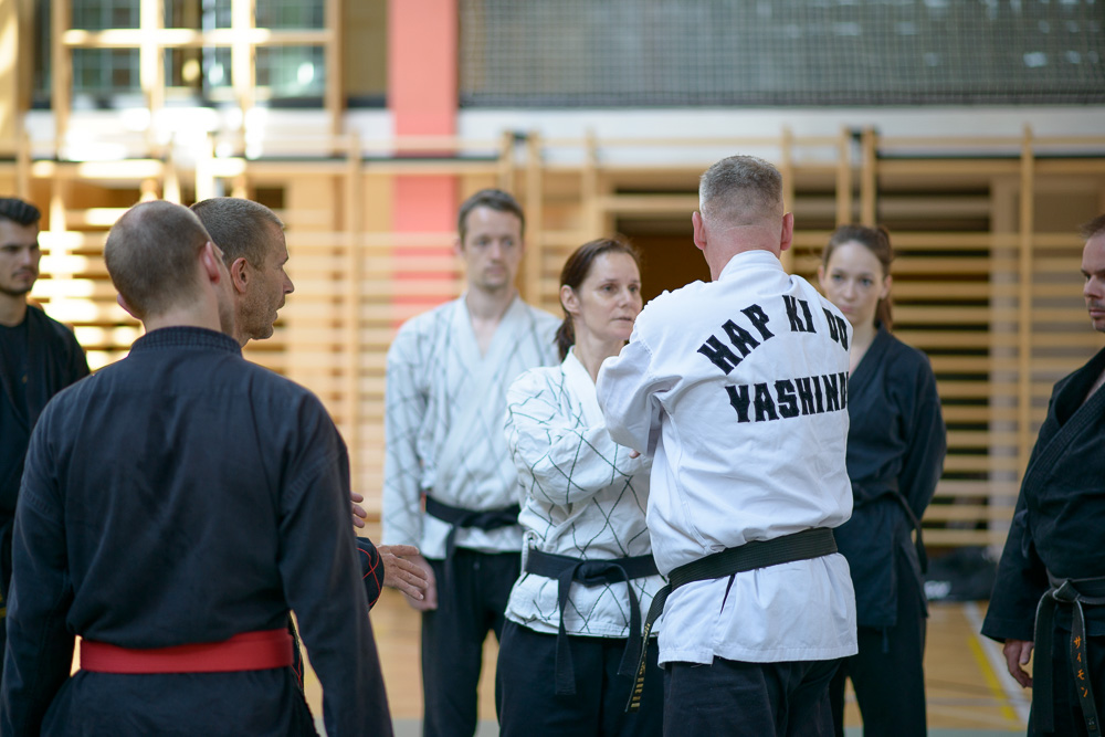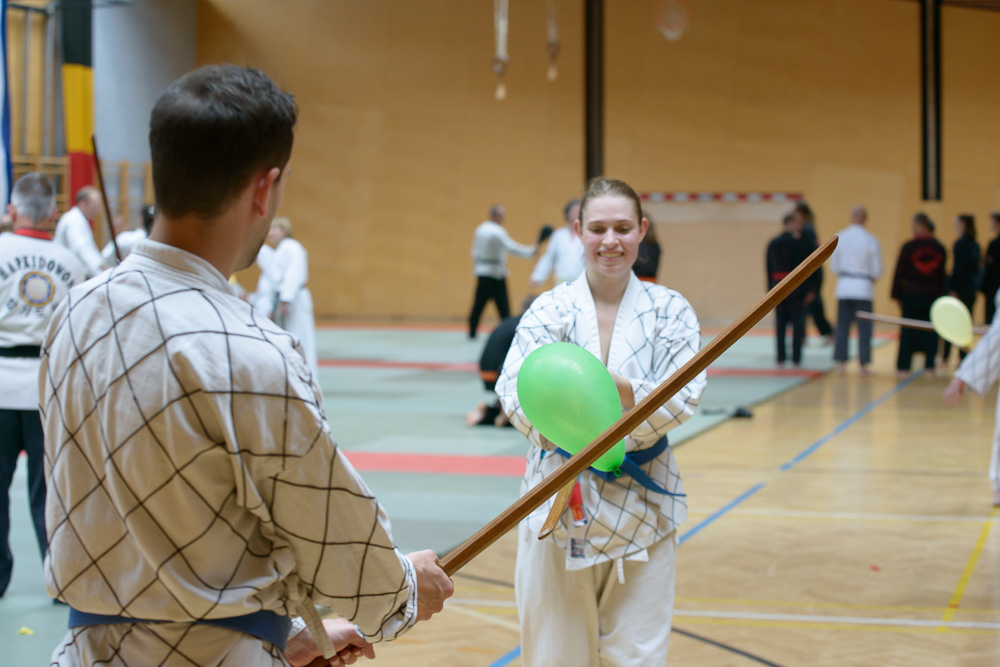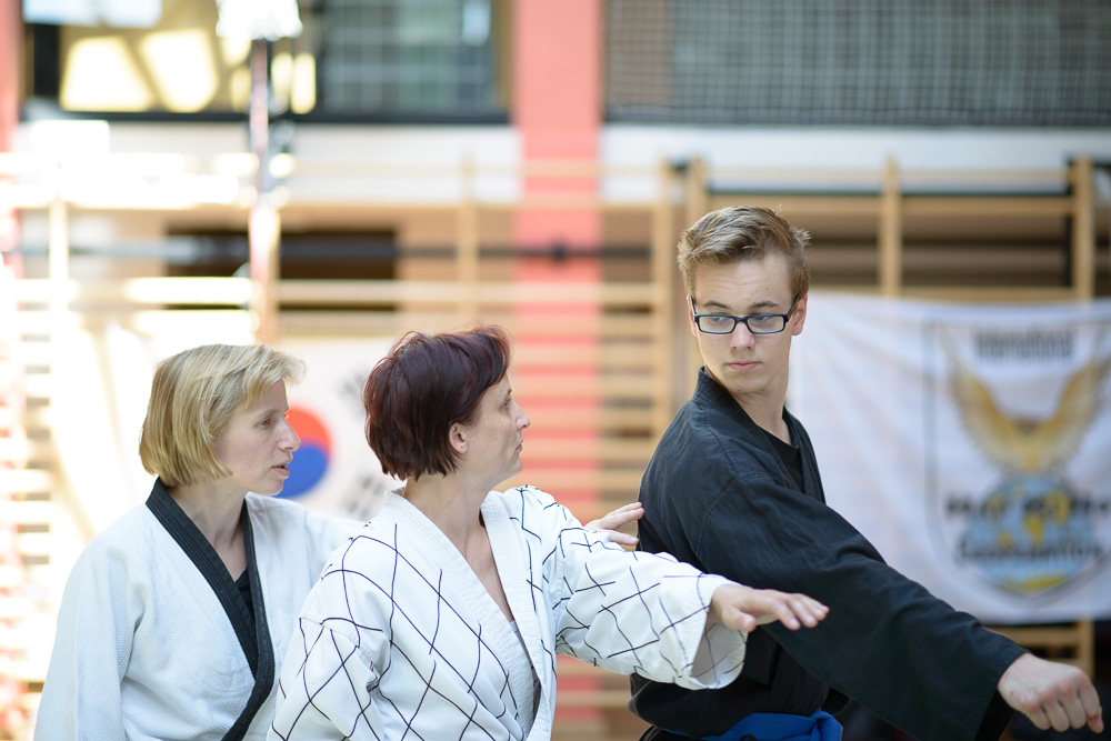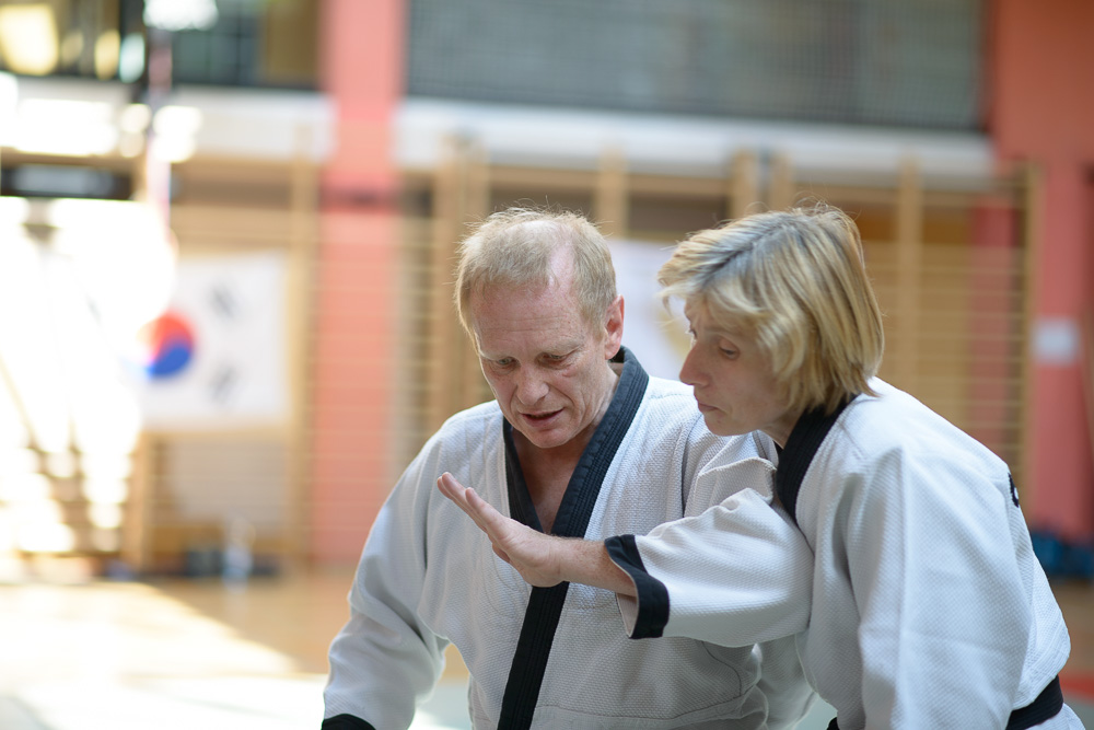 Volker Gössling zeigte ursprüngliche, geradlinige Hapkido Techniken, seine Ehefrau Nadine begeisterte ihre Zuhörer mit einer fundierten Trainingseinheit zur Messerabwehr, die so manch einem die Augen zur besonderen Gefährlichkeit einer solchen Waffe geöffnet hat.