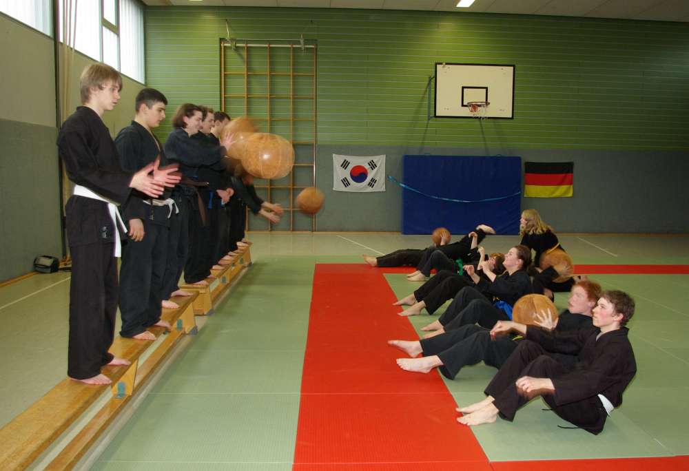 Der erste Landeslehrgang im neuen Jahr lockte über 30 Hapkidoin ins winterliche Clarholz. Unser Lehrwart David Bruchholder, 3. Dan, hatte Techniken mit dem Lang- sowie mit dem Kurzstock als Lehrgangsthema ausgeschrieben und übernahm auch selbst die Leitung. Im ersten Lehrgangsteil stand der Langstock auf dem Programm. Schon die Gymnastik erfolgte mit der Waffe in der Hand, um beim Aufwärmen gleichzeitig zu erreichen, dass sich jeder an den Umgang mit dem langen Stock gewöhnen konnte.