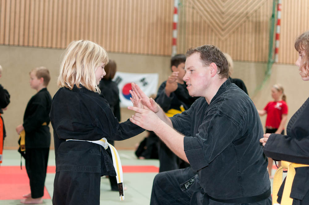 Schon beim Üben der Grundlagen in der Blockformation hallten die Kampfesschreie der Schülerinnen und Schüler furchteinflößend durch das Doyang. Grund dafür waren die 47 Teilnehmer (aus Clarholz, Holzwickede, Oelde, Bönen, Gütersloh, Beckum und Einheimischen), die an diesem Tag den Weg nach Schwerte gefunden hatten, um sich gemeinsam mit Referent Tobias Lohre, 2. Dan aus Schwerte einen Tag lang den Grundlagen des Kampfes zu widmen.